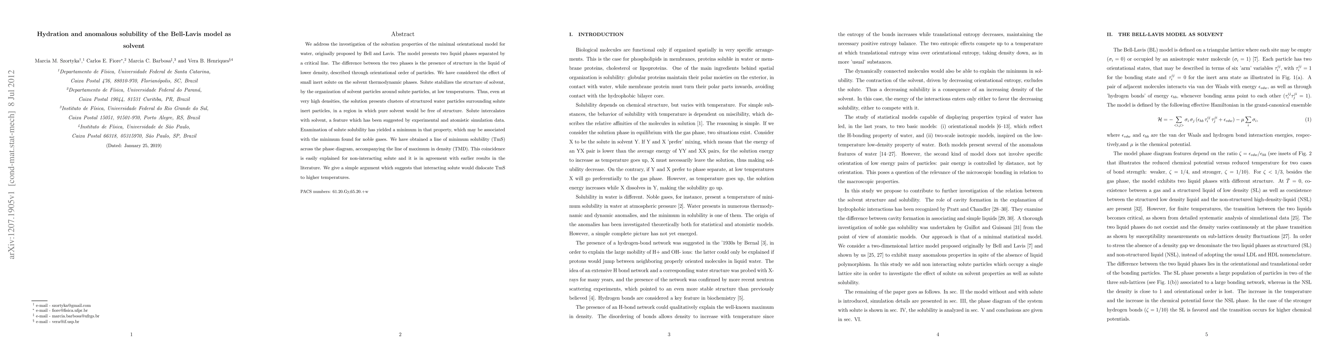 This paper investigates the solvation properties of the Bell-Lavis water model, revealing that a small inert solute stabilizes the structured phase of the solvent at low temperatures. The study finds a line of minimum solubility in the phase diagram, analogous to noble gases, suggesting solute interaction could shift this line to higher temperatures.