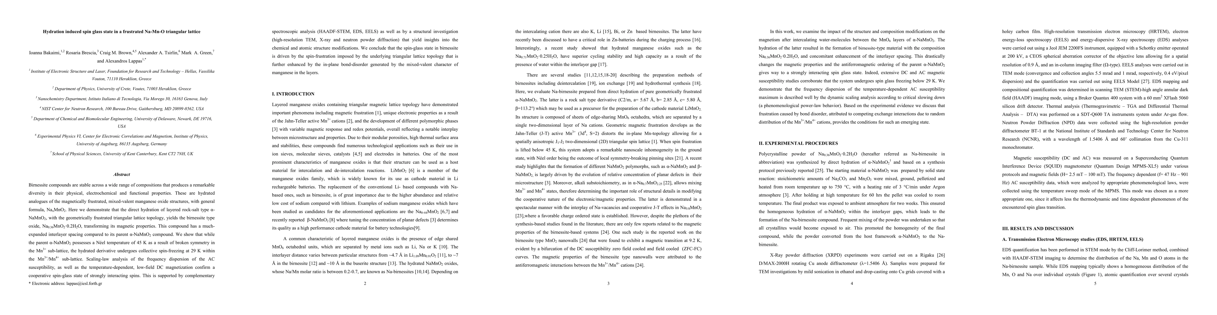 Hydration of a-NaMnO2 induces a spin-glass state in the resulting Na0.36MnO2·0.2H2O birnessite, driven by spin-frustration in its triangular lattice and enhanced by mixed-valent manganese disorder. This transformation is confirmed through AC susceptibility, DC magnetization, and structural analyses.
