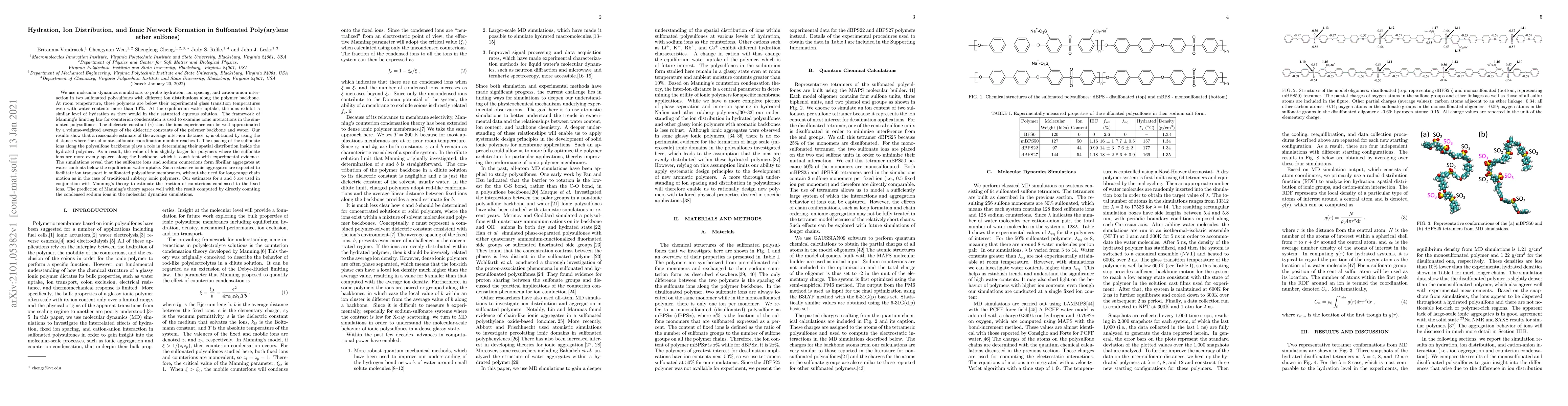 Researchers used molecular dynamics simulations to study hydration and ionic network formation in sulfonated polysulfones, finding that ions form fibrillar aggregates at low water contents and facilitating ion transport without the need for long-range chain motion.