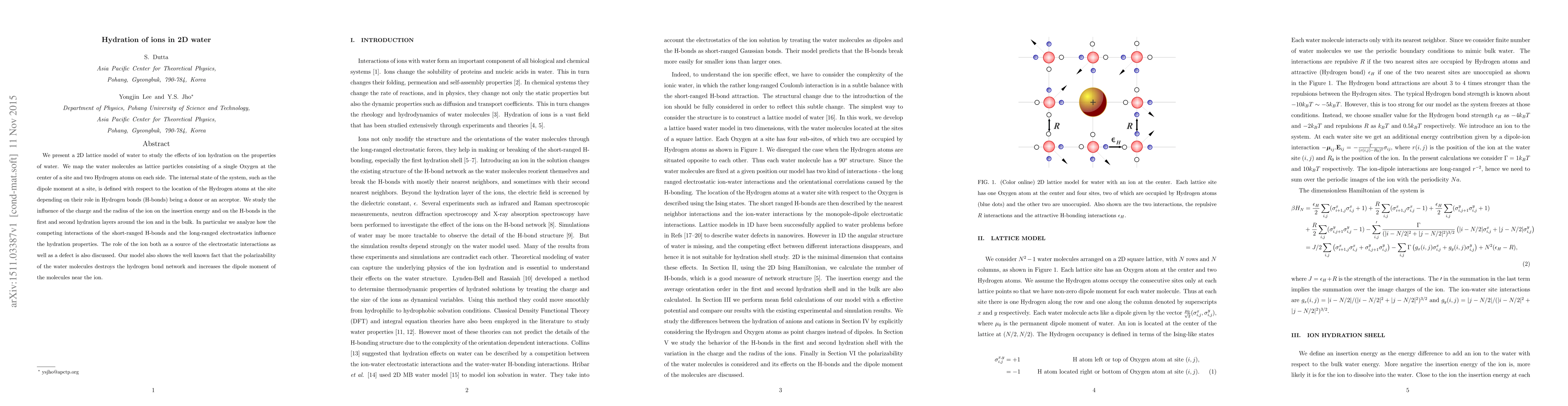 This research introduces a 2D lattice model to study ion hydration effects on water, examining how ion charge and radius impact insertion energy and hydration layers. It highlights the interplay between short-range H-bonds and long-range electrostatics, as well as the ion's role as both an electrostatic source and a defect. The model reveals that ion presence disrupts the H-bond network, increasing water molecule polarizability and dipole moment.