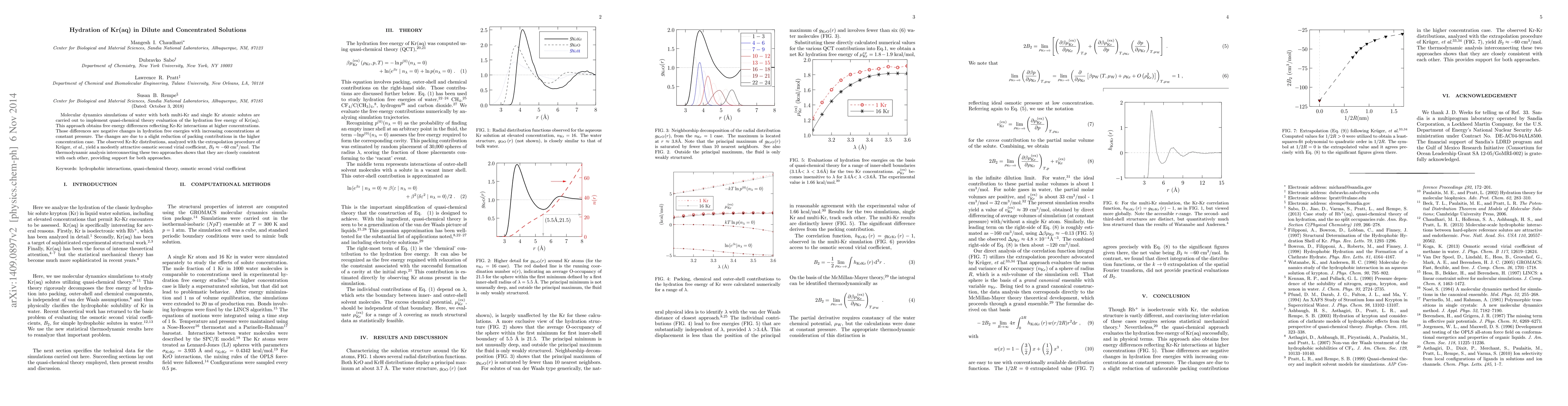 Molecular dynamics simulations of water with both multi-Kr and single Kr atomic solutes are carried out to implement quasi-chemical theory evaluation of the hydration free energy of Kr(aq). This approach obtains free energy differences reflecting Kr-Kr interactions at higher concentrations. Those differences are negative changes in hydration free energies with increasing concentrations at constant pressure. The changes are due to a slight reduction of packing contributions in the higher concentration case. The observed Kr-Kr distributions, analyzed with the extrapolation procedure of Kr\"{u}ger, \emph{et al.}, yield a modestly attractive osmotic second virial coefficient, $B_2\approx -60~\mathrm{cm}^3$/mol. The thermodynamic analysis interconnecting these two approaches shows that they are closely consistent with each other, providing support for both.