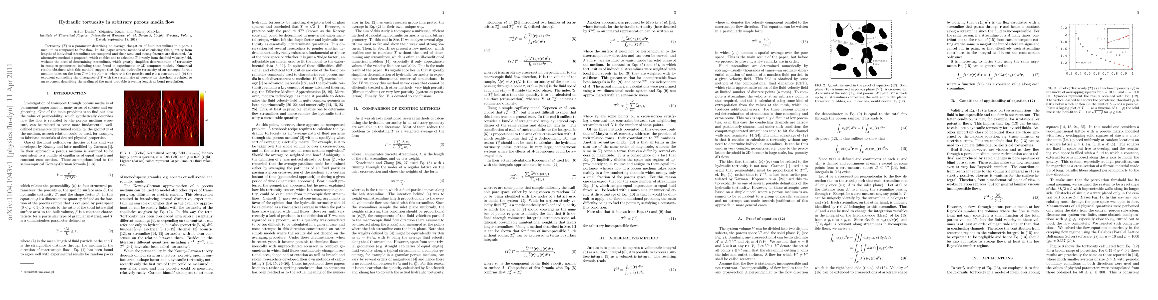This paper compares various methods for calculating hydraulic tortuosity in porous media, proposing an alternative method that directly uses fluid velocity fields. The new method simplifies tortuosity determination in complex geometries and suggests that hydraulic tortuosity in fibrous media follows $T = 1 + p\sqrt{1-\phi}$, where $p$ is a constant and $\phi$ is porosity.