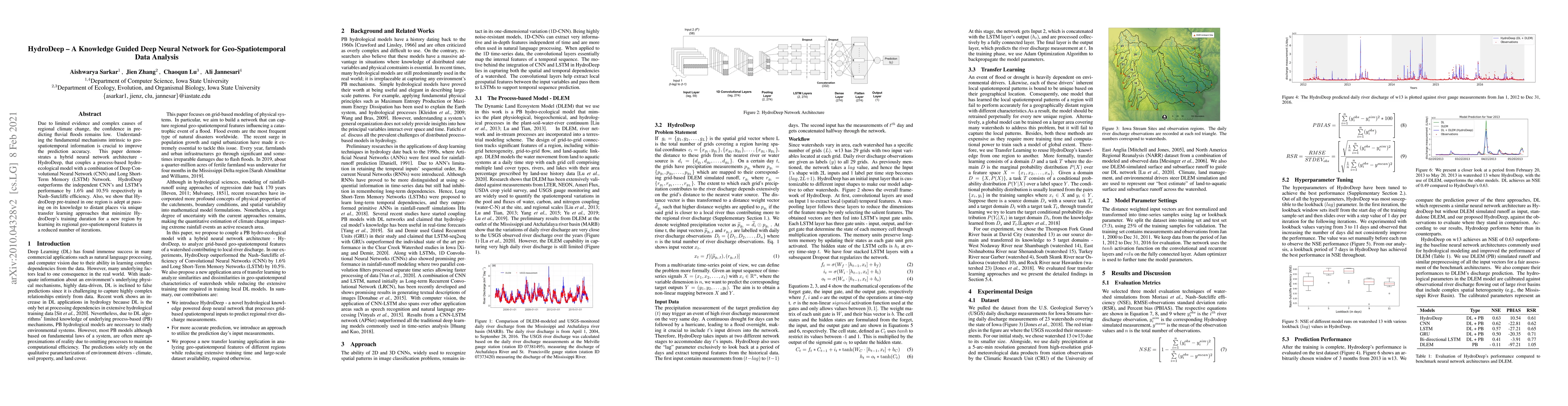 Due to limited evidence and complex causes of regional climate change, the confidence in predicting fluvial floods remains low. Understanding the fundamental mechanisms intrinsic to geo-spatiotemporal information is crucial to improve the prediction accuracy. This paper demonstrates a hybrid neural network architecture - HydroDeep, that couples a process-based hydro-ecological model with a combination of Deep Convolutional Neural Network (CNN) and Long Short-Term Memory (LSTM) Network. HydroDeep outperforms the independent CNN's and LSTM's performance by 1.6% and 10.5% respectively in Nash-Sutcliffe efficiency. Also, we show that HydroDeep pre-trained in one region is adept at passing on its knowledge to distant places via unique transfer learning approaches that minimize HydroDeep's training duration for a new region by learning its regional geo-spatiotemporal features in a reduced number of iterations.