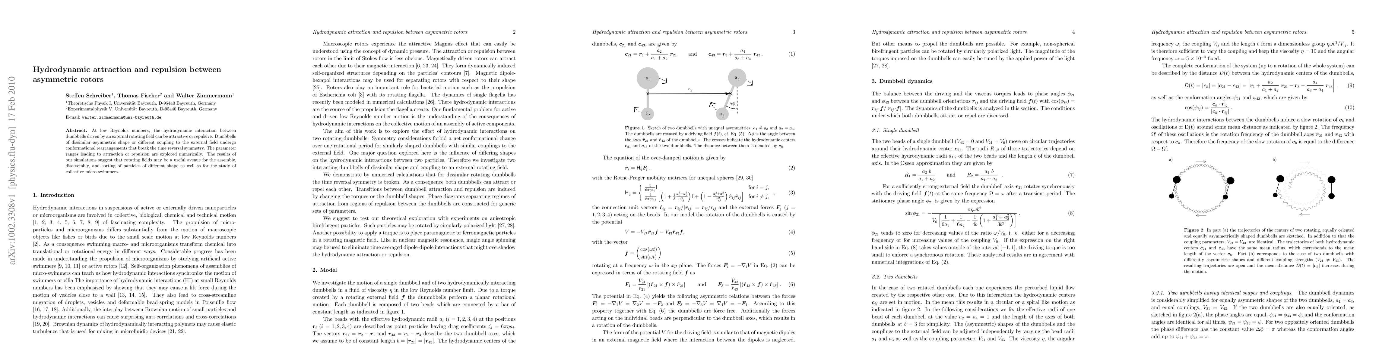 This paper investigates hydrodynamic interactions between asymmetric rotors at low Reynolds numbers, finding that they can exhibit attractive or repulsive forces depending on their shape and coupling to a rotating field. Numerical simulations reveal potential applications in particle assembly and sorting, as well as in studying collective micro-swimmers.