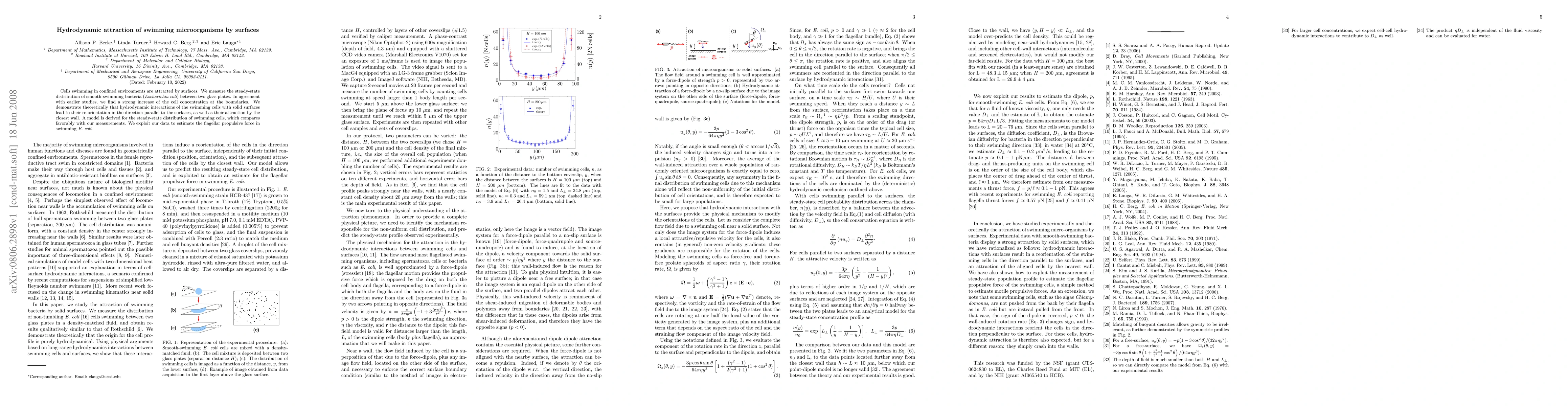 This study investigates the hydrodynamic attraction of Escherichia coli bacteria to surfaces in confined environments, finding a higher concentration near boundaries due to re-orientation and attraction by the closest wall. A theoretical model is developed to match experimental observations and is used to estimate the flagellar propulsive force in E. coli.