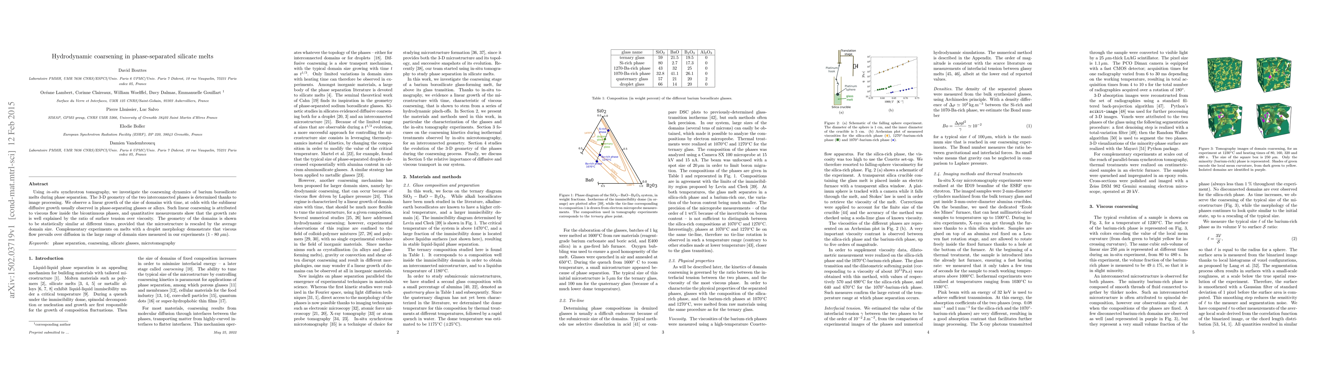 Using in-situ synchrotron tomography, we investigate the coarsening dynamics of barium borosilicate melts during phase separation. The 3-D geometry of the two interconnected phases is determined thanks to image processing. We observe a linear growth of the size of domains with time, at odds with the sublinear diffusive growth usually observed in phase-separating glasses or alloys. Such linear coarsening is attributed to viscous flow inside the bicontinuous phases, and quantitative measurements show that the growth rate is well explained by the ratio of surface tension over viscosity. The geometry of the domains is shown to be statistically similar at different times, provided that the microstructure is rescaled by the average domain size. Complementary experiments on melts with a droplet morphology demonstrate that viscous flow prevails over diffusion in the large range of domain sizes measured in our experiments (1 - 80 microns).