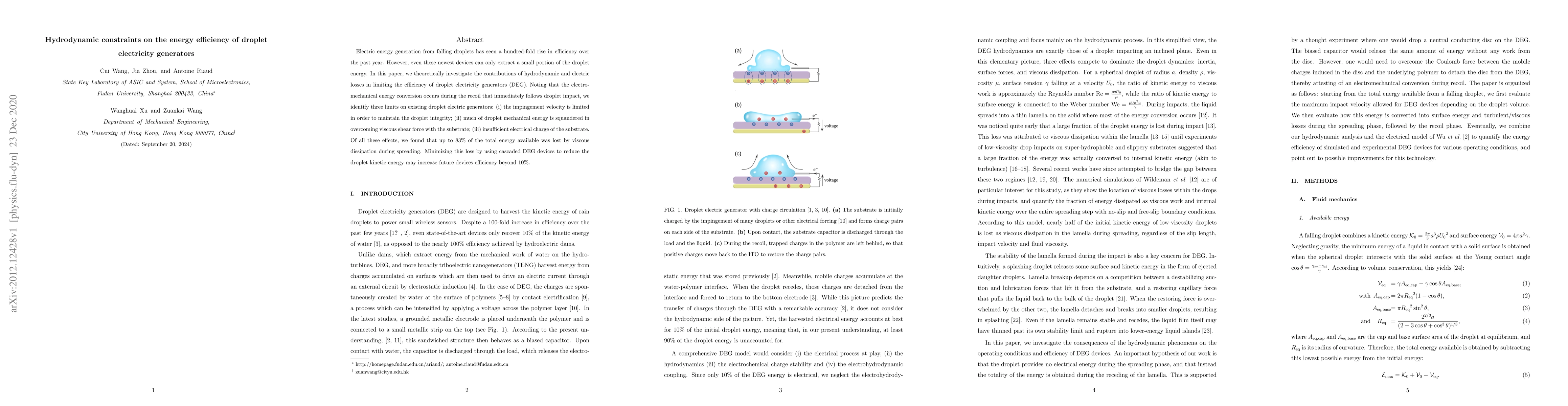 Electric energy generation from falling droplets has seen a hundred-fold rise in efficiency over the past year. However, even these newest devices can only extract a small portion of the droplet energy. In this paper, we theoretically investigate the contributions of hydrodynamic and electric losses in limiting the efficiency of droplet electricity generators (DEG). Noting that the electro-mechanical energy conversion occurs during the recoil that immediately follows droplet impact, we identify three limits on existing droplet electric generators: (i) the impingement velocity is limited in order to maintain the droplet integrity; (ii) much of droplet mechanical energy is squandered in overcoming viscous shear force with the substrate; (iii) insufficient electrical charge of the substrate. Of all these effects, we found that up to 83% of the total energy available was lost by viscous dissipation during spreading. Minimizing this loss by using cascaded DEG devices to reduce the droplet kinetic energy may increase future devices efficiency beyond 10%.
