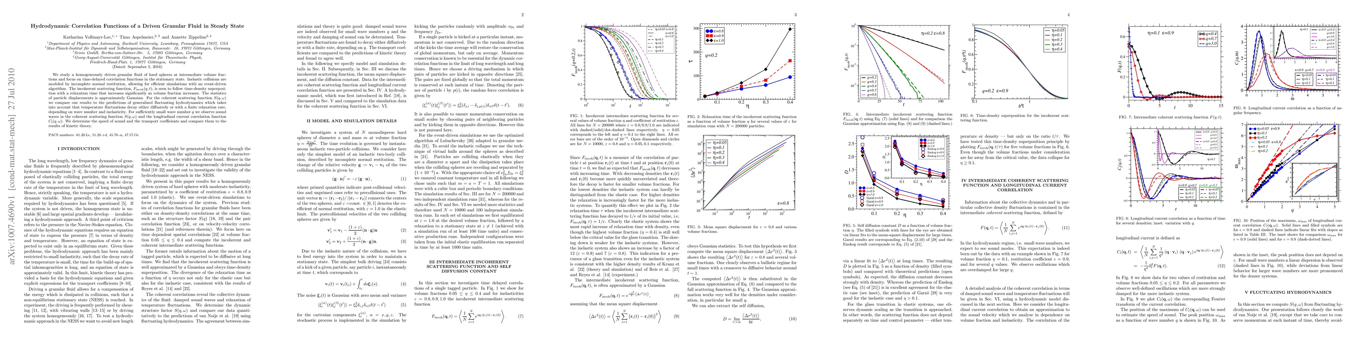 This paper investigates hydrodynamic correlation functions in a driven granular fluid of hard spheres, finding that the incoherent scattering function follows time-density superposition with increasing relaxation time at higher volume fractions. The study also reveals the presence of sound waves in the coherent scattering function and compares transport coefficients to kinetic theory predictions.