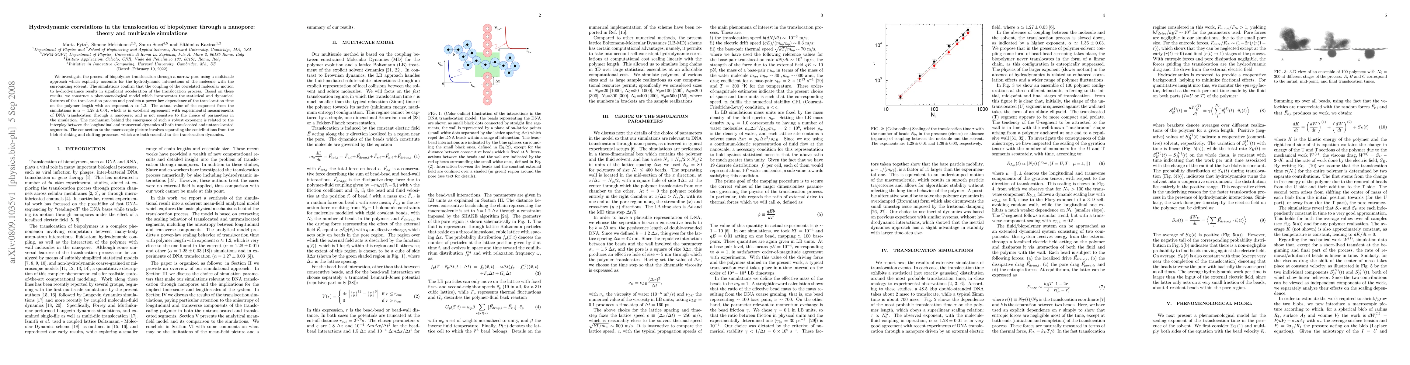 This paper explores biopolymer translocation through a nanopore using multiscale simulations, revealing that hydrodynamic interactions significantly accelerate the process. The study proposes a phenomenological model predicting a translocation time power law with an exponent $\alpha \approx 1.2$, closely matching experimental data and highlighting the interplay between molecular and solvent dynamics.