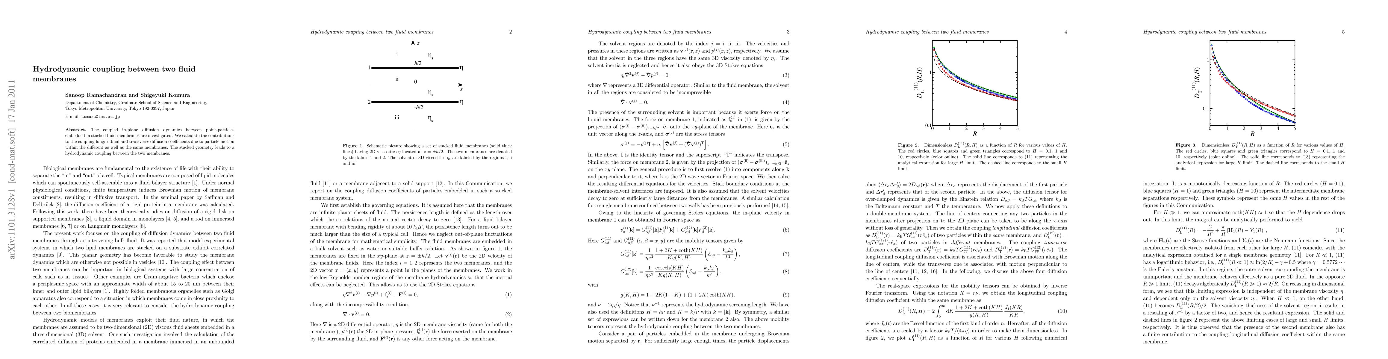 This paper investigates the hydrodynamic coupling between two stacked fluid membranes through the in-plane diffusion dynamics of point-particles embedded within them. The study calculates the coupling's longitudinal and transverse diffusion coefficients, revealing the effects of particle motion across and within the membranes.