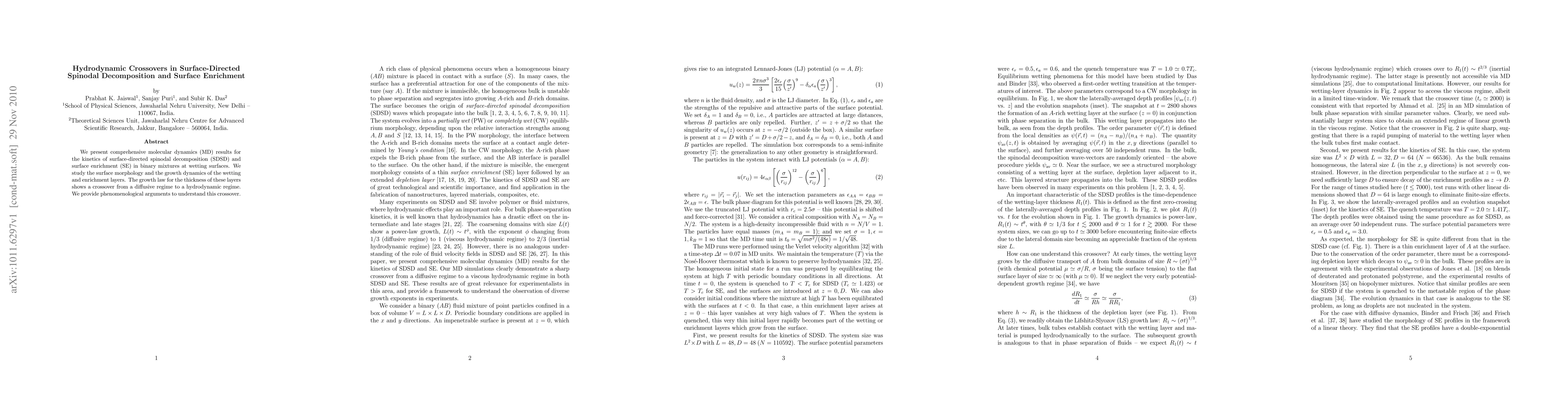 This paper uses molecular dynamics simulations to study the kinetics of surface-directed spinodal decomposition and surface enrichment in binary mixtures at wetting surfaces, revealing a crossover in the growth dynamics of wetting and enrichment layers from a diffusive to a hydrodynamic regime. The authors provide phenomenological explanations for this observed crossover.