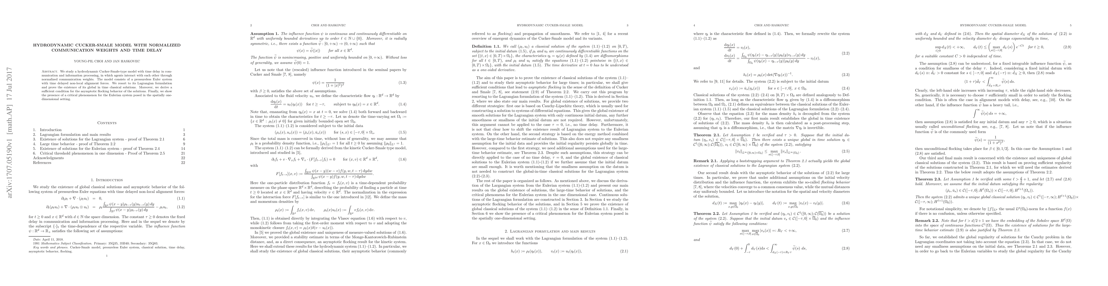 This paper investigates a hydrodynamic Cucker-Smale model with time delay and normalized communication weights, proving the existence of global classical solutions and deriving conditions for asymptotic flocking behavior. It also reveals a critical phenomenon in the one-dimensional Eulerian system.
