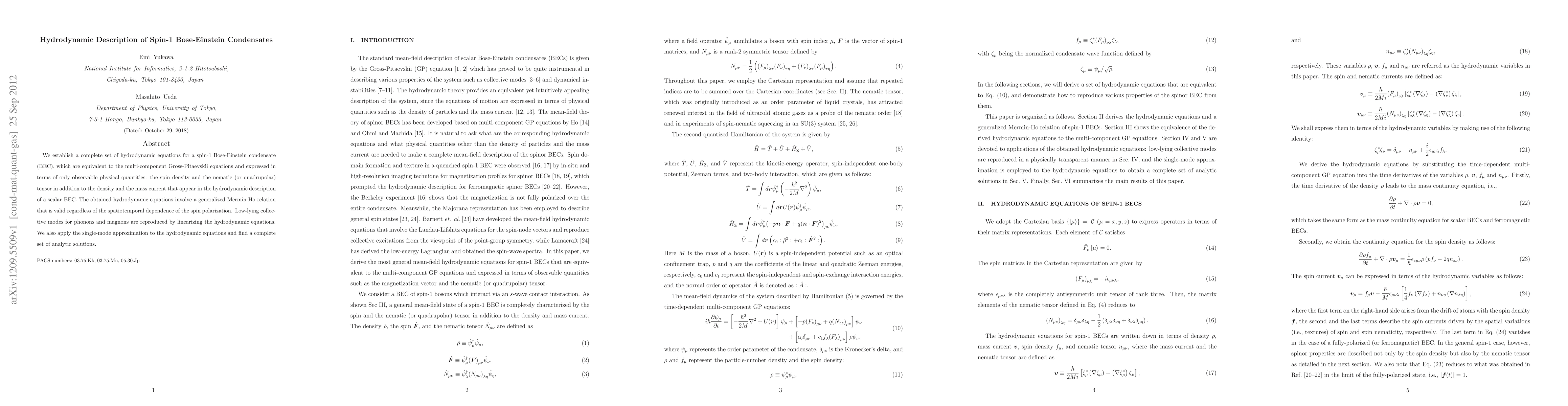 We establish a complete set of hydrodynamic equations for a spin-1 Bose-Einstein condensate (BEC), which are equivalent to the multi-component Gross-Pitaevskii equations and expressed in terms of only observable physical quantities: the spin density and the nematic (or quadrupolar) tensor in addition to the density and the mass current that appear in the hydrodynamic description of a scalar BEC. The obtained hydrodynamic equations involve a generalized Mermin-Ho relation that is valid regardless of the spatiotemporal dependence of the spin polarization. Low-lying collec- tive modes for phonons and magnons are reproduced by linearizing the hydrodynamic equations. We also apply the single-mode approximation to the hydrodynamic equations and find a complete set of analytic solutions.