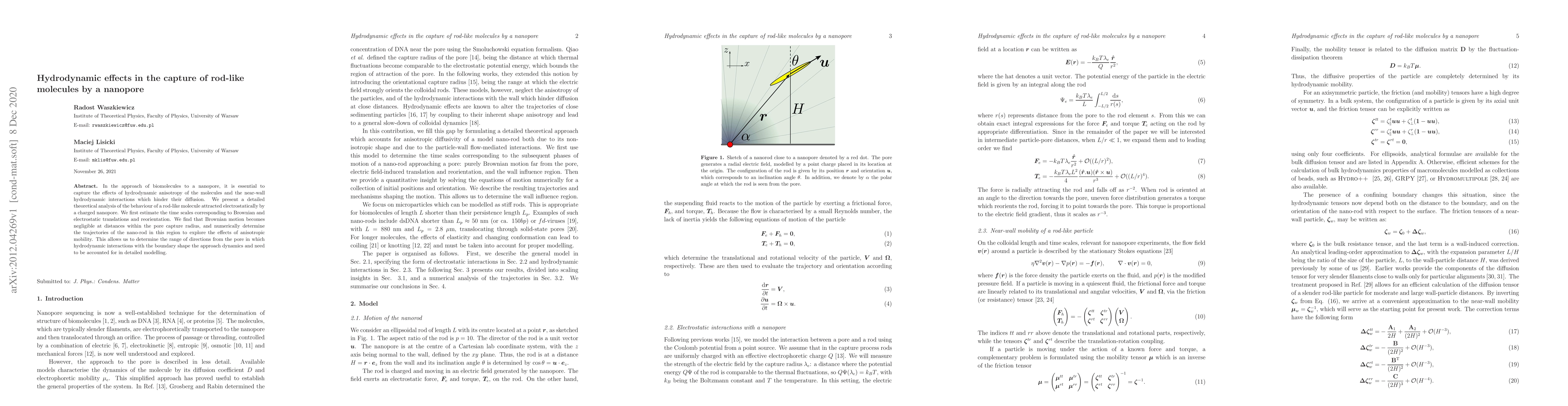 This paper presents a theoretical analysis of how hydrodynamic anisotropy and near-wall interactions affect the capture of rod-like molecules by a charged nanopore, finding that Brownian motion is negligible within the capture radius and determining the influence of anisotropic mobility on the approach dynamics.