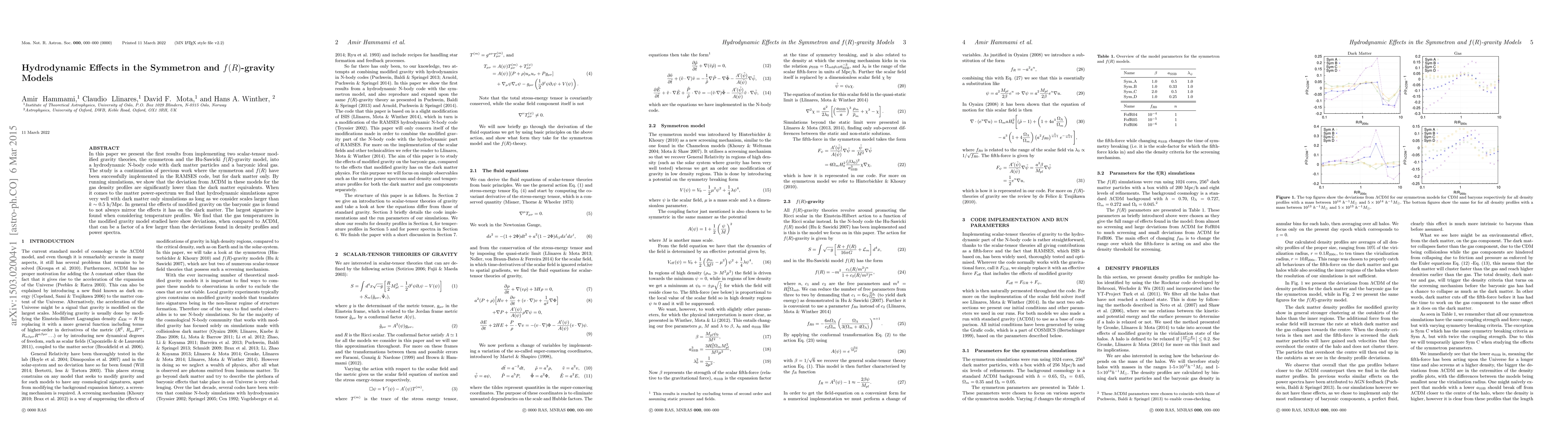 In this paper we present the first results from implementing two scalar-tensor modified gravity theories, the symmetron and the Hu-Sawicki $f(R)$-gravity model, into a hydrodynamic N-body code with dark matter particles and a baryonic ideal gas. The study is a continuation of previous work where the symmetron and $f(R)$ have been successfully implemented in the RAMSES code, but for dark matter only. By running simulations, we show that the deviation from $\Lambda$CDM in these models for the gas density profiles are significantly lower than the dark matter equivalents. When it comes to the matter power-spectrum we find that hydrodynamic simulations agree very well with dark matter only simulations as long as we consider scales larger than $k\sim 0.5$ h/Mpc. In general the effects of modified gravity on the baryonic gas is found to not always mirror the effects it has on the dark matter. The largest signature is found when considering temperature profiles. We find that the gas temperatures in the modified gravity model studied here show deviations, when compared to $\Lambda$CDM, that can be a factor of a few larger than the deviations found in density profiles and power spectra.