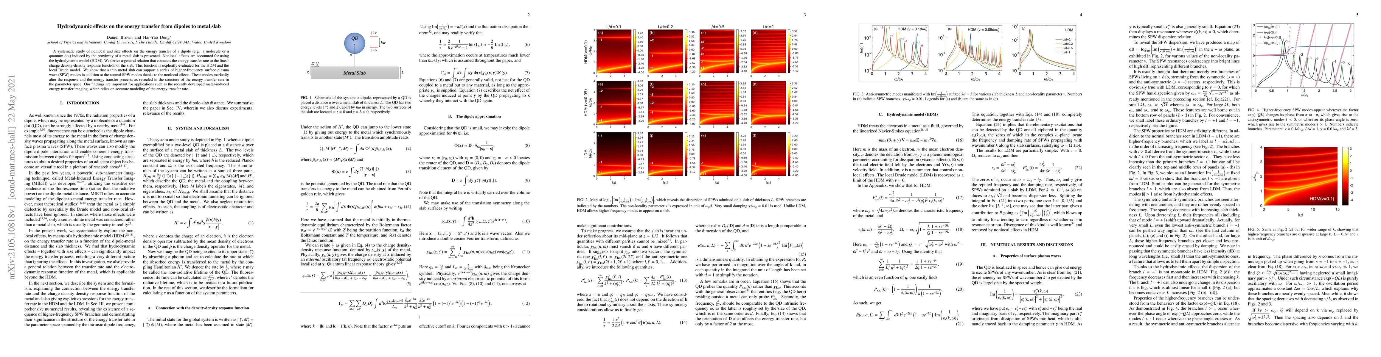 A systematic study of nonlocal and size effects on the energy transfer of a dipole (e.g. a molecule or a quantum dot) induced by the proximity of a metal slab is presented. Nonlocal effects are accounted for using the hydrodynamic model (HDM). We derive a general relation that connects the energy transfer rate to the linear charge density-density response function of the slab. This function is explicitly evaluated for the HDM and the local Drude model. We show that a thin metal slab can support a series of higher-frequency surface plasma wave (SPW) modes in addition to the normal SPW modes thanks to the nonlocal effects. These modes markedly alter the response and the energy transfer process, as revealed in the structure of the energy transfer rate in the parameter space. Our findings are important for applications such as the recently developed metal-induced energy transfer imaging, which relies on accurate modeling of the energy transfer rate.