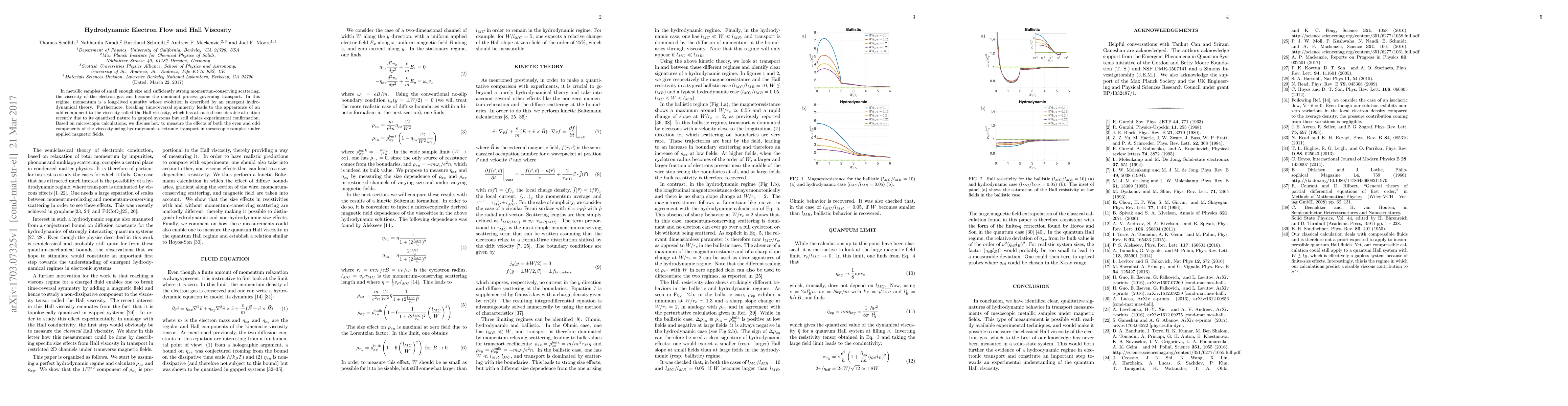 This paper explores the hydrodynamic behavior of electron flow in small metallic samples, focusing on the even and odd components of viscosity, particularly the Hall viscosity, under strong momentum-conserving scattering. It proposes a method to measure these effects through hydrodynamic electronic transport in mesoscopic samples under magnetic fields.