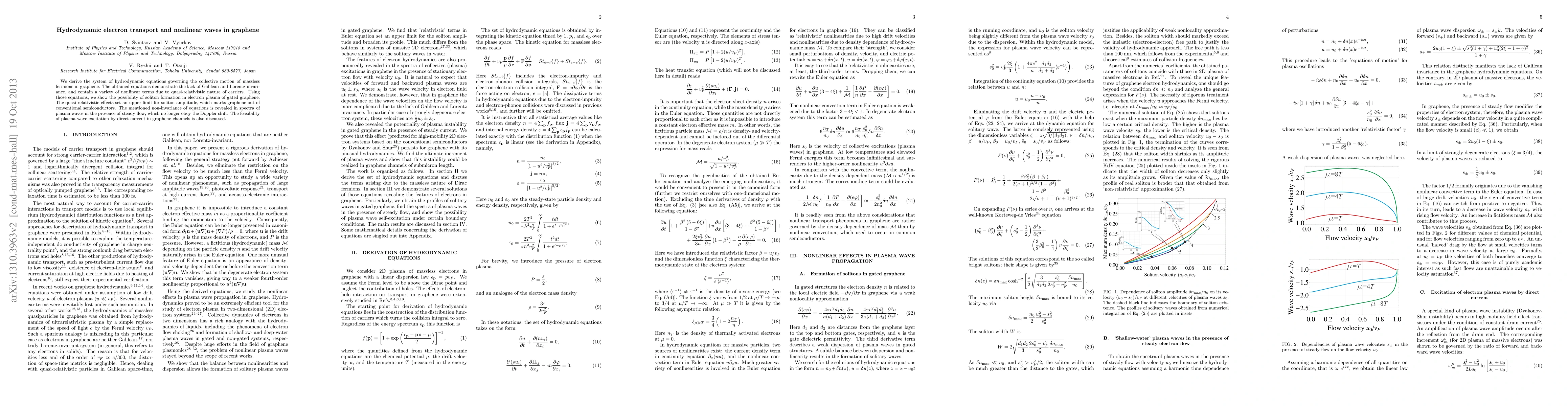 This paper derives hydrodynamic equations for graphene's electron transport, highlighting the lack of Galilean- and Lorentz invariance and the emergence of nonlinear solitons due to quasi-relativistic effects. It discusses the unique upper amplitude limit for solitons in graphene's electron plasma compared to conventional semiconductors.