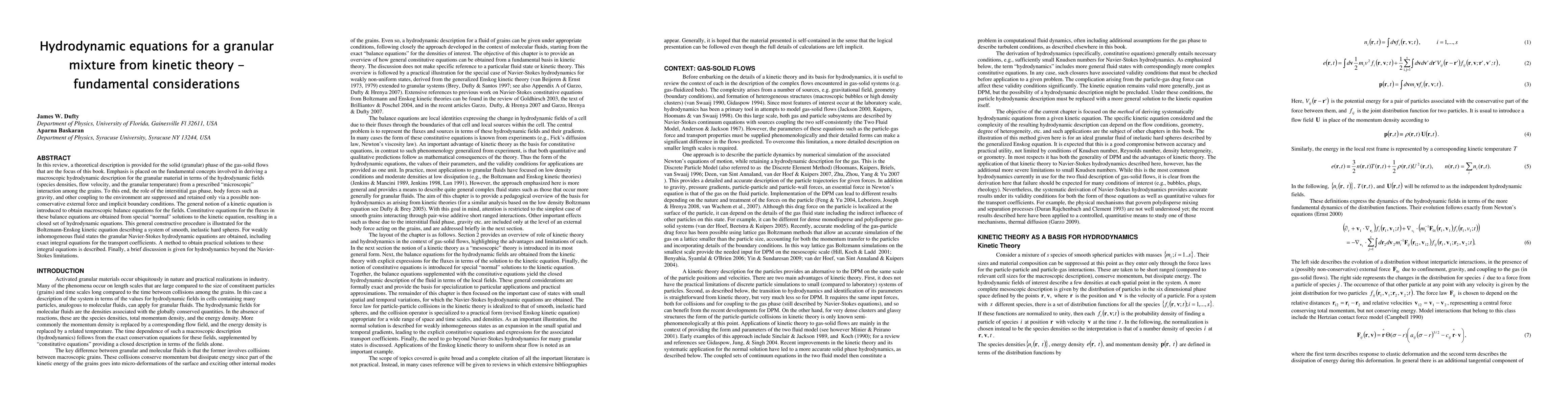 In this review, a theoretical description is provided for the solid (granular) phase of the gas-solid flows that are the focus of this book. Emphasis is placed on the fundamental concepts involved in deriving a macroscopic hydrodynamic description for the granular material in terms of the hydrodynamic fields (species densities, flow velocity, and the granular temperature) from a prescribed "microscopic" interaction among the grains. To this end, the role of the interstitial gas phase, body forces such as gravity, and other coupling to the environment are suppressed and retained only via a possible non-conservative external force and implicit boundary conditions. The general notion of a kinetic equation is introduced to obtain macroscopic balance equations for the fields. Constitutive equations for the fluxes in these balance equations are obtained from special "normal" solutions to the kinetic equation, resulting in a closed set of hydrodynamic equations. This general constructive procedure is illustrated for the Boltzmann-Enskog kinetic equation describing a system of smooth, inelastic hard spheres. For weakly inhomogeneous fluid states the granular Navier-Stokes hydrodynamic equations are obtained, including exact integral equations for the transport coefficients. A method to obtain practical solutions to these integral equations is described. Finally, a brief discussion is given for hydrodynamics beyond the Navier-Stokes limitations.