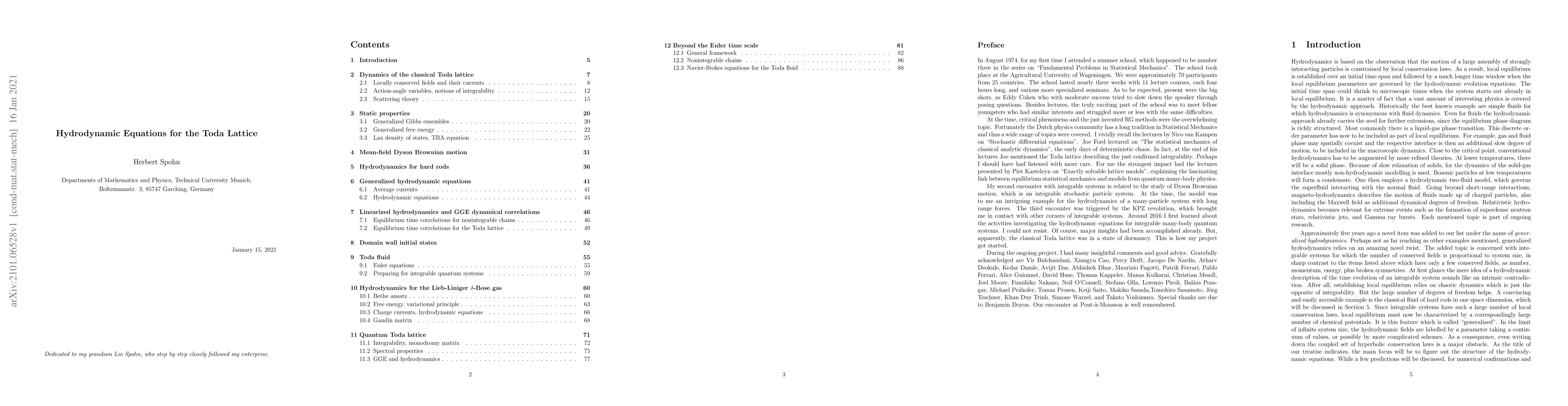 1. Introduction, 2. Dynamics of the classical Toda lattice, 3. Static properties, 4. Mean-field Dyson Brownian motion, 5. Hydrodynamics for hard rods, 6. Generalized hydrodynamic equations, 7. Linearized hydrodynamics and GGE dynamical correlations, 8. Domain wall initial states, 9. Toda fluid, 10. Hydrodynamics for the Lieb-Liniger delta-Bose gas, 11. Quantum Toda lattice, 12. Beyond the Euler time scale.