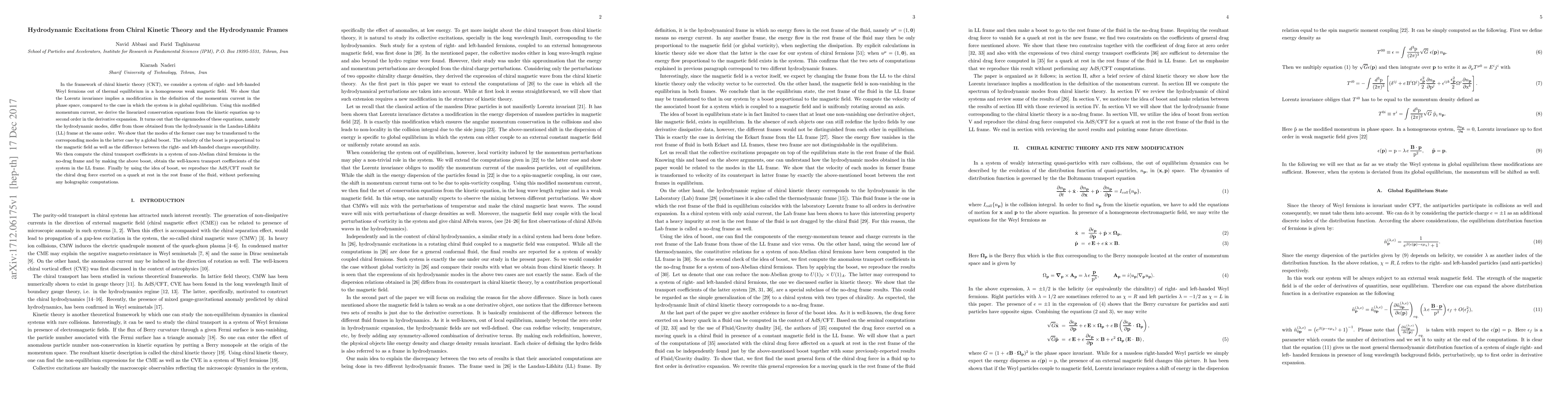 In the framework of chiral kinetic theory (CKT), we consider a system of right- and left-handed Weyl fermions out of thermal equilibrium in a homogeneous weak magnetic field. We show that the Lorentz invariance implies a modification in the definition of the momentum current in the phase space, compared to the case in which the system is in global equilibrium. Using this modified momentum current, we derive the linearized conservation equations from the kinetic equation up to second order in the derivative expansion. It turns out that the eigenmodes of these equations, namely the hydrodynamic modes, differ from those obtained from the hydrodynamic in the Landau-Lifshitz (LL) frame at the same order. We show that the modes of the former case may be transformed to the corresponding modes in the latter case by a global boost. The velocity of the boost is proportional to the magnetic field as well as the difference between the right- and left-handed charges susceptibility. We then compute the chiral transport coefficients in a system of non-Abelian chiral fermions in the no-drag frame and by making the above boost, obtain the well-known transport coeffiecients of the system in the LL frame. Finally by using the idea of boost, we reproduce the AdS/CFT result for the chiral drag force exerted on a quark at rest in the rest frame of the fluid, without performing any holographic computations.