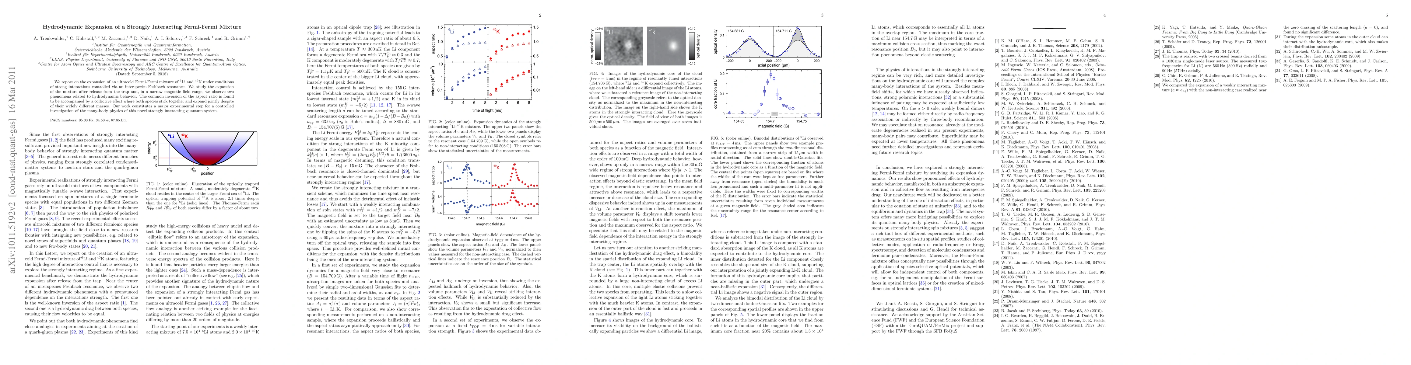 We report on the expansion of a Fermi-Fermi mixture of Li-6 and K-40 atoms under conditions of strong interactions realized near the center of an interspecies Feshbach resonance. We observe two different phenomena of hydrodynamic behavior. The first one is the well-known inversion of the aspect ratio. The second one is a collective expansion, where both species stick together and despite of their different masses expand jointly. Our work constitutes a first step to explore the intriguing many-body physics of this novel system.