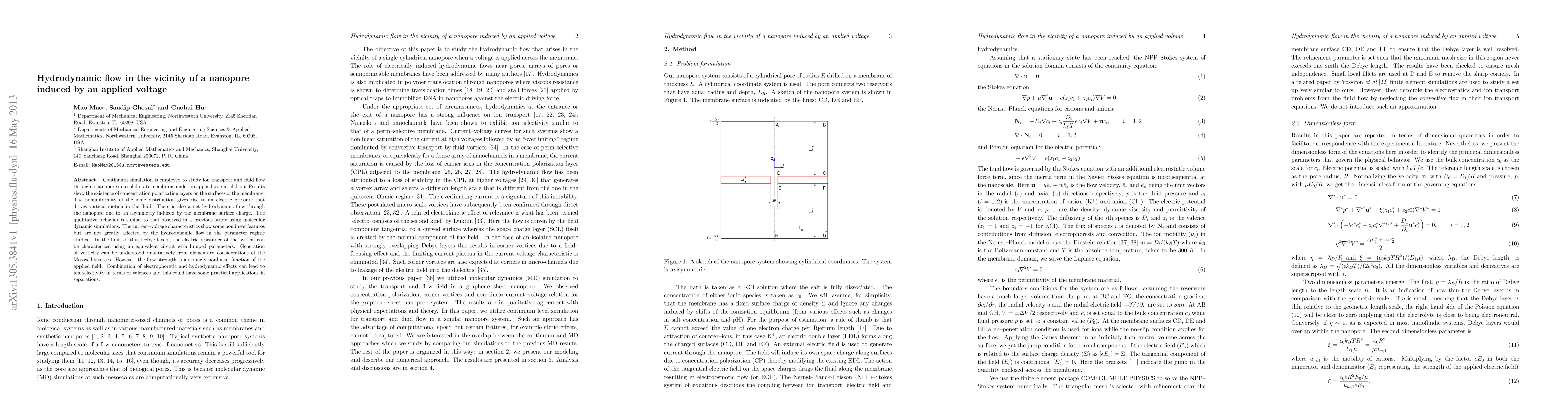 Continuum simulation is employed to study ion transport and fluid flow through a nanopore in a solid-state membrane under an applied potential drop. Results show the existence of concentration polarization layers on the surfaces of the membrane. The nonuniformity of the ionic distribution gives rise to an electric pressure that drives vortical motion in the fluid. There is also a net hydrodynamic flow through the nanopore due to an asymmetry induced by the membrane surface charge. The qualitative behavior is similar to that observed in a previous study using molecular dynamic simulations. The current--voltage characteristics show some nonlinear features but are not greatly affected by the hydrodynamic flow in the parameter regime studied. In the limit of thin Debye layers, the electric resistance of the system can be characterized using an equivalent circuit with lumped parameters. Generation of vorticity can be understood qualitatively from elementary considerations of the Maxwell stresses. However, the flow strength is a strongly nonlinear function of the applied field. Combination of electrophoretic and hydrodynamic effects can lead to ion selectivity in terms of valences and this could have some practical applications in separations.