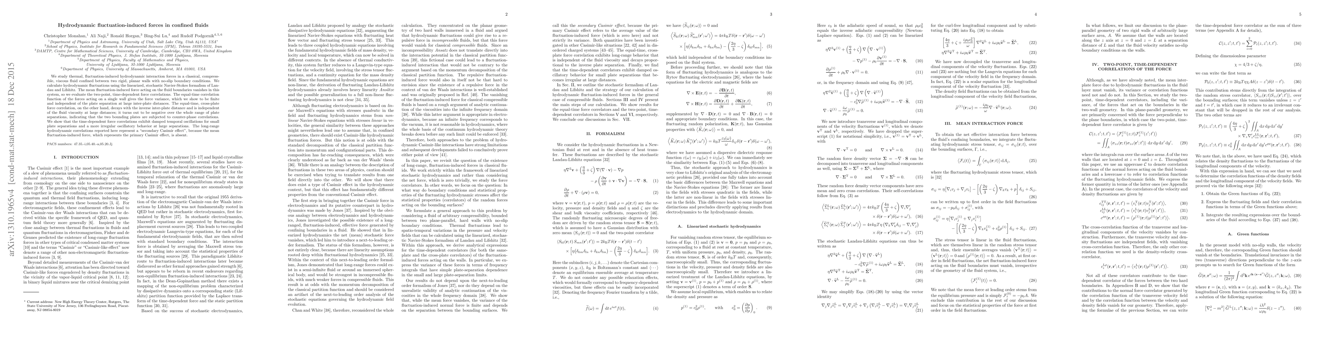 This paper investigates hydrodynamic forces due to thermal fluctuations in a confined, viscous fluid between two rigid walls, revealing finite force variance independent of plate separation at large distances. The study finds that cross-plate force correlations decay inversely with distance and exhibit damped oscillations at small separations, highlighting a "secondary Casimir effect" due to the absence of mean fluctuation-induced forces.