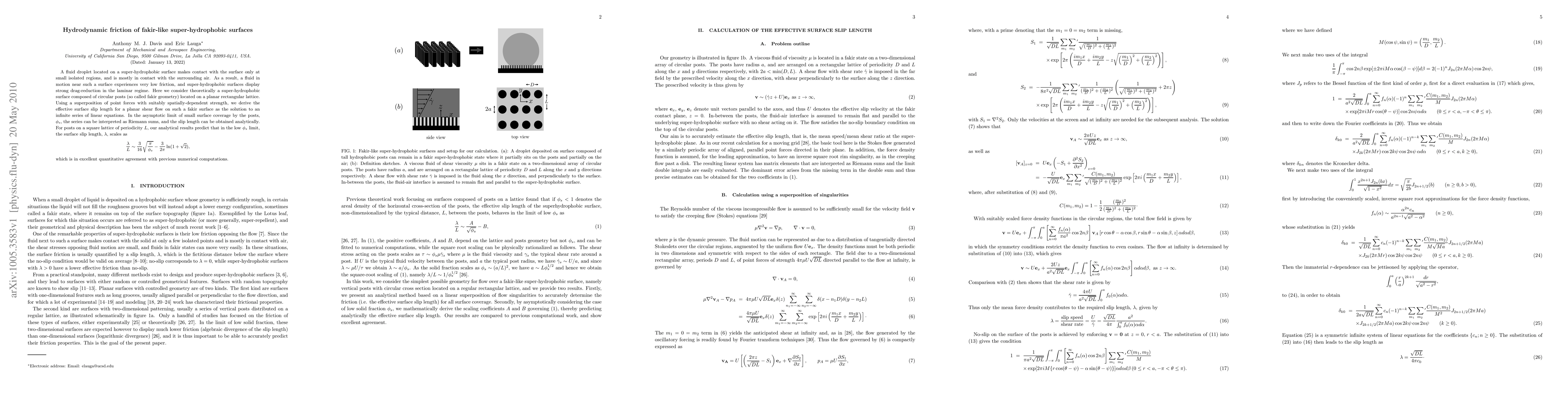 This research investigates the hydrodynamic friction of super-hydrophobic surfaces, specifically those with a fakir geometry of circular posts. The study derives the effective surface slip length for laminar flow, showing strong drag-reduction due to minimal contact between fluid and surface, and provides analytical solutions for a square lattice configuration that align well with previous numerical results.