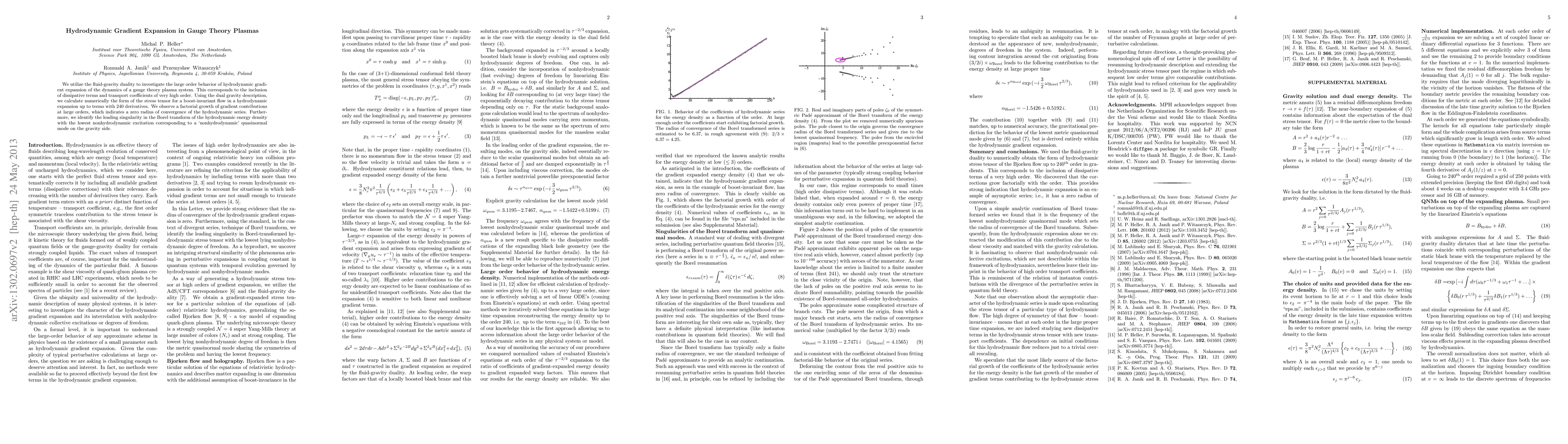 This paper investigates the hydrodynamic gradient expansion in gauge theory plasmas using fluid-gravity duality, revealing a factorial growth of gradient contributions indicating zero convergence radius. It numerically calculates the stress tensor up to 240 derivatives, linking the leading singularity in the hydrodynamic energy density to the lowest nonhydrodynamic excitation in the dual gravity description.