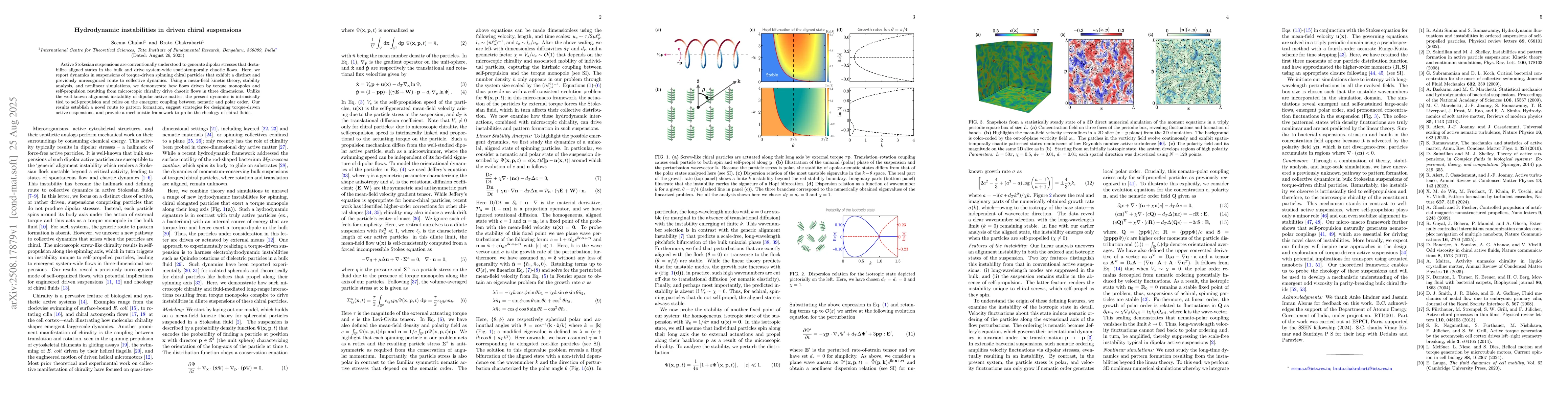 Active Stokesian suspensions are conventionally understood to generate dipolar stresses that destabilize aligned states in the bulk and drive system-wide spatiotemporally chaotic flows. Here, we report dynamics in suspensions of torque-driven spinning chiral particles that exhibit a distinct and previously unrecognized route to collective dynamics. Using a mean-field kinetic theory, stability analysis, and nonlinear simulations, we demonstrate how flows driven by torque monopoles and self-propulsion resulting from microscopic chirality drive chaotic flows in three dimensions. Unlike the well-known alignment instability of dipolar active matter, the present dynamics is intrinsically tied to self-propulsion and relies on the emergent coupling between nematic and polar order. Our results establish a novel route to pattern formation, suggest strategies for designing torque-driven active suspensions, and provide a mechanistic framework to probe the rheology of chiral fluids.