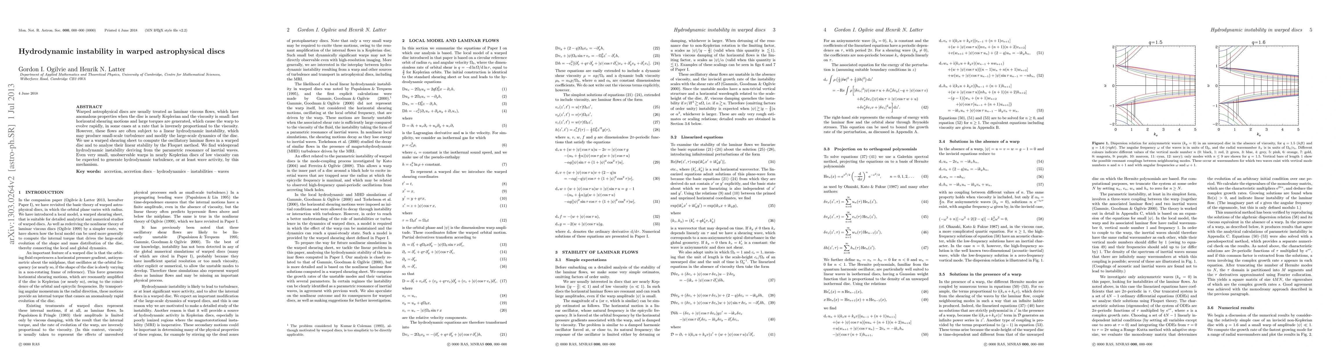 This paper investigates the hydrodynamic instability in warped astrophysical discs, finding that even small warps in nearly Keplerian discs with low viscosity can generate turbulence via parametric resonance of inertial waves, affecting the disc's large-scale dynamics. The study employs a warped shearing sheet and the Floquet method to analyze the linear stability of these flows.