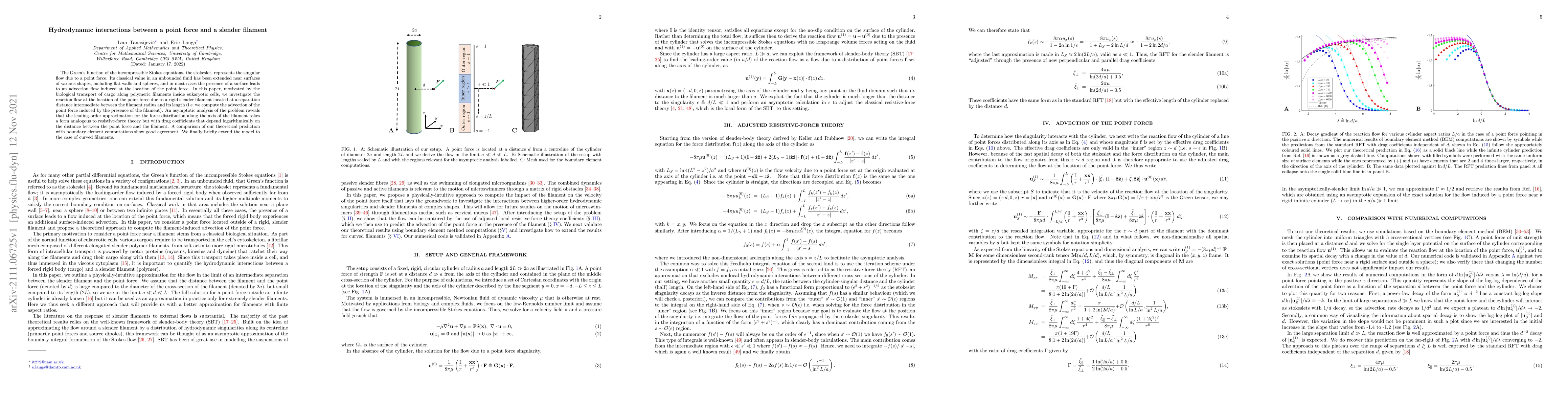 Researchers studied how a point force affects a slender filament in fluid dynamics, finding that the flow generated can drag the force along the filament's axis, with drag coefficients varying logarithmically with distance from the filament.