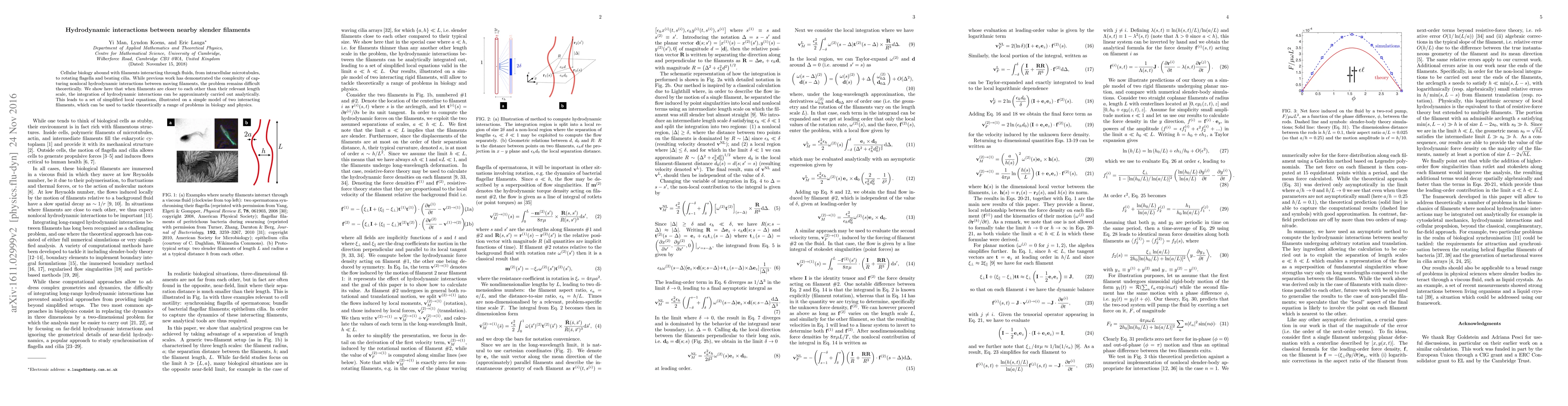 This paper develops an analytical approach to simplify the hydrodynamic interactions between nearby slender filaments, providing a set of local equations that can be applied to various biological and physical systems involving filament interactions. The method offers a theoretical framework for understanding complex interactions in cellular biology.