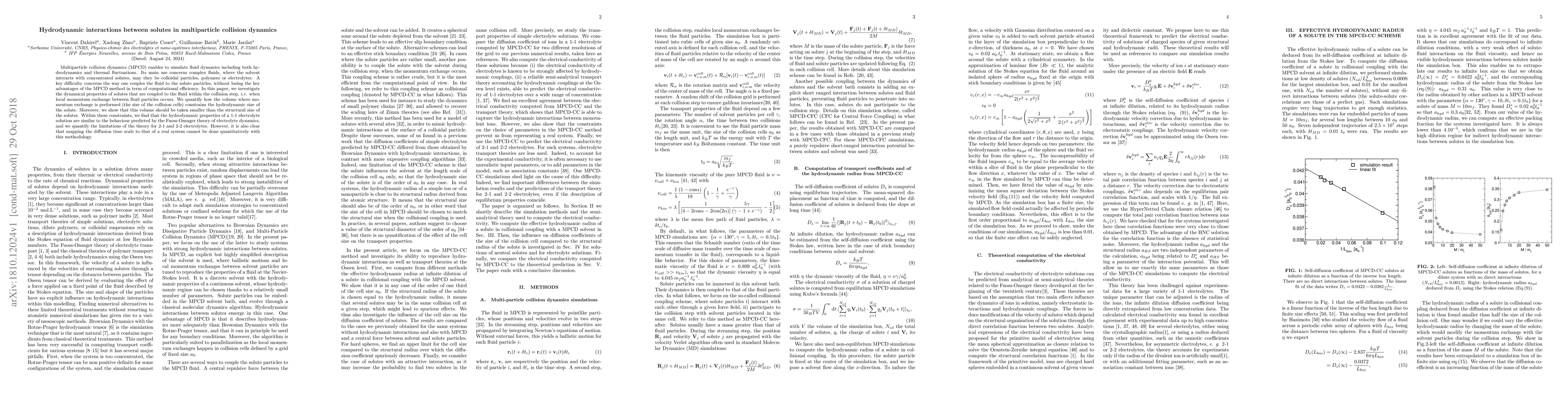 This paper explores hydrodynamic interactions between solutes and fluids in multiparticle collision dynamics (MPCD), focusing on the coupling of solutes during momentum exchange. It finds that the size of the collision cells must be smaller than the structural size of solutes to accurately represent hydrodynamic properties, and while it aligns with Fuoss-Onsager theory for 1-1 electrolytes, it cannot quantitatively map diffusion timescales to real systems.