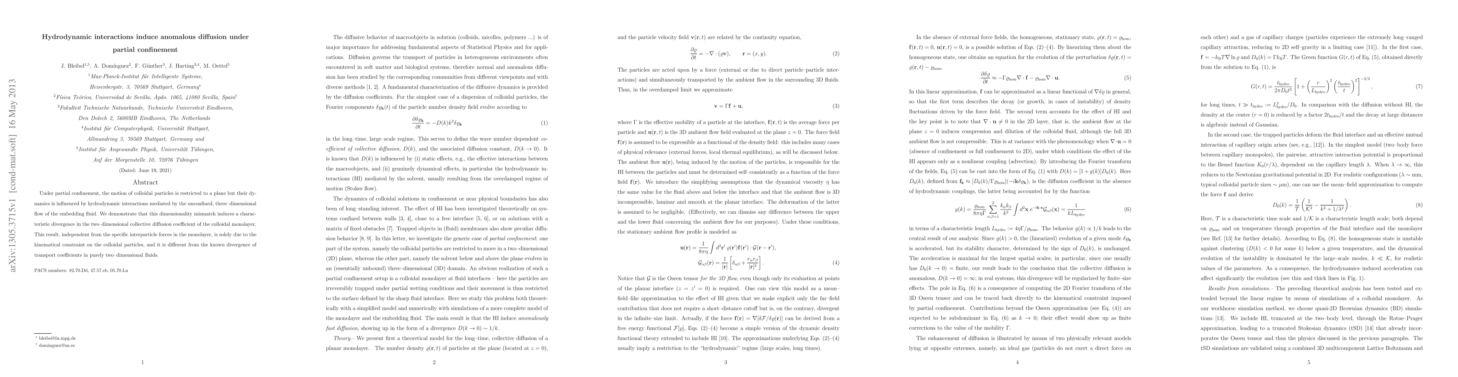 This paper demonstrates that hydrodynamic interactions under partial confinement lead to anomalous diffusion in colloidal particles, characterized by a divergence in the collective diffusion coefficient due to the mismatch between two-dimensional motion and three-dimensional fluid flow. This effect is independent of interparticle forces and distinct from divergences in purely two-dimensional fluids.