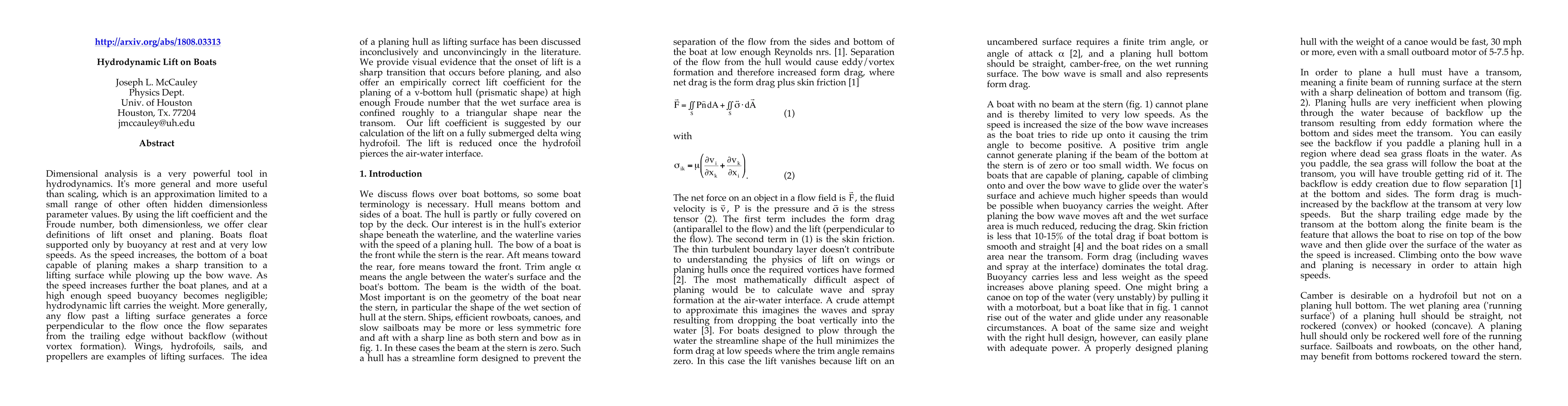 Boats float supported only by buoyancy at rest and at very low speeds. As the speed increases, a hull capable of planing makes a sharp transition to a lifting surface while plowing up the bow wave. As the speed increases further the boat planes, and at a high enough speed buoyancy becomes negligible; hydrodynamic lift carries the weight. More generally, any flow past a lifting surface generates a force perpendicular to the flow once the flow separates from the trailing edge without backflow (without vortex formation). Wings, hydrofoils, sails, and propellers are examples of lifting surfaces. The idea of a planing hull as lifting surface has been discussed inconclusively in the literature. We provide evidence for the onset of lift before planing and also produce an empirically correct lift coefficient for the planing of a v-bottom (prismatic shape) hull at high enough speeds that the wet surface area is confined roughly to a triangular shape near the transom. Our model follows our calculation of the lift on a fully submerged delta wing hydrofoil. The lift is reduced once the hydrofoil pierces the air-water interface.