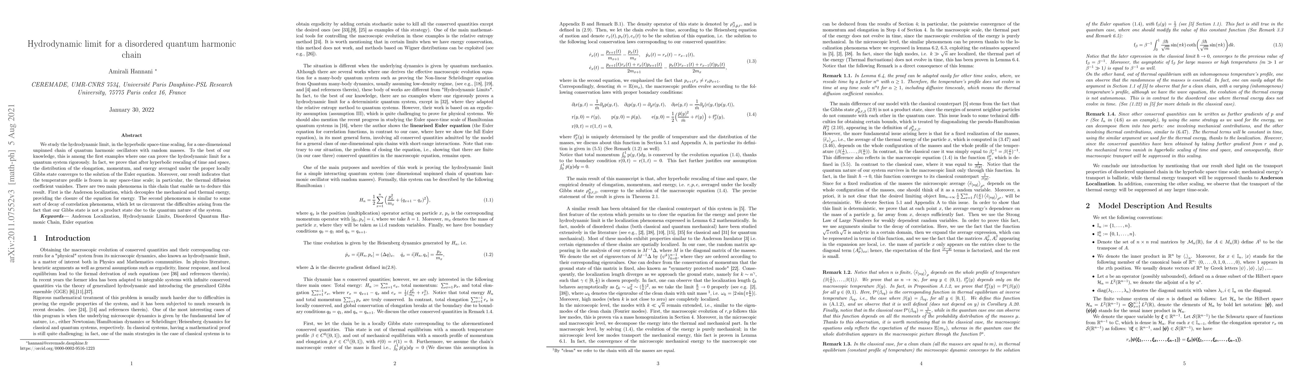 This paper rigorously proves the hydrodynamic limit for a disordered quantum harmonic chain, demonstrating convergence to the Euler equation under hyperbolic scaling. The study leverages Anderson localization and a decay of correlation phenomenon to address the quantum nature of the system and frozen temperature profiles.