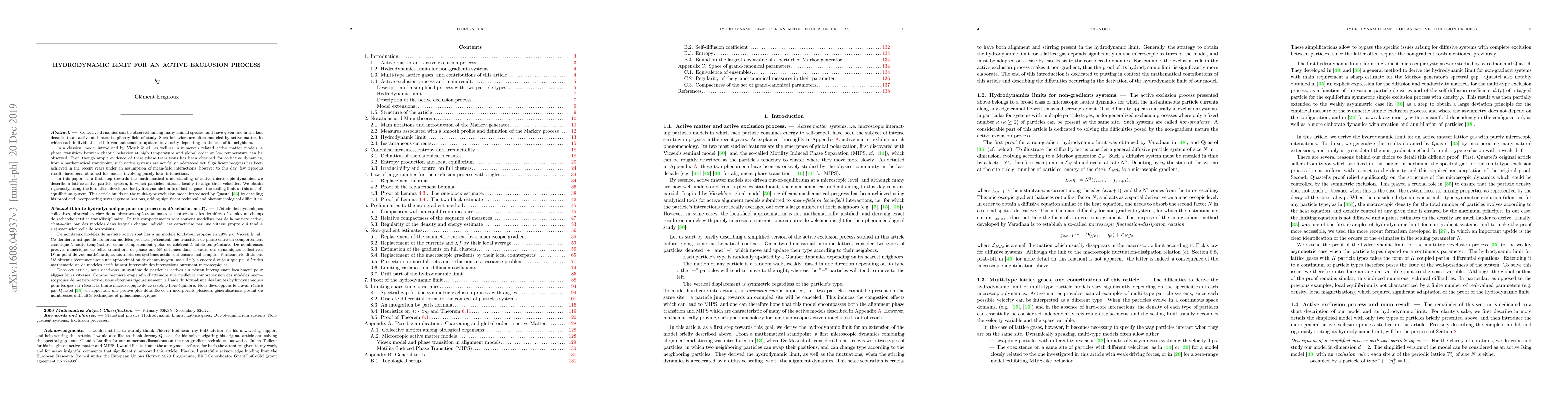 Collective dynamics can be observed among many animal species, and have given rise in the last decades to an active and interdisciplinary field of study. Such behaviors are often modeled by active matter, in which each individual is self-driven and tends to update its velocity depending on the one of its neighbors. In a classical model introduced by Vicsek and al., as well as in numerous related active matter models, a phase transition between chaotic behavior at high temperature and global order at low temperature can be observed. Even though ample evidence of these phase transitions has been obtained for collective dynamics, from a mathematical standpoint, such active systems are not fully understood yet. Significant progress has been achieved in the recent years under an assumption of mean-field interactions, however to this day, few rigorous results have been obtained for models involving purely local interactions. In this paper, as a first step towards the mathematical understanding of active microscopic dynamics, we describe a lattice active particle system, in which particles interact locally to align their velocities. We obtain rigorously, using the formalism developed for hydrodynamic limits of lattice gases, the scaling limit of this out-of-equilibrium system. This article builds on the multi-type exclusion model introduced by Quastel by detailing his proof and incorporating several generalizations, adding significant technical and phenomenological difficulties.