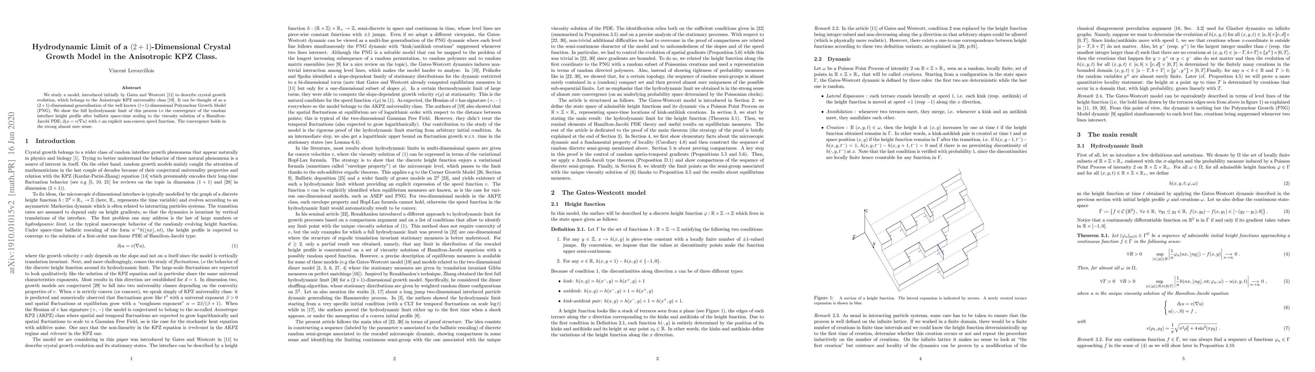 We study a model, introduced initially by Gates and Westcott to describe crystal growth evolution, which belongs to the Anisotropic KPZ universality class. It can be thought of as a $(2+1)$-dimensional generalisation of the well known (1+1)-dimensional Polynuclear Growth Model (PNG). We show the full hydrodynamic limit of this process i.e the convergence of the random interface height profile after ballistic space-time scaling to the viscosity solution of a Hamilton-Jacobi PDE: $\partial_tu = v(\nabla u)$ with $v$ an explicit non-convex speed function. The convergence holds in the strong almost sure sense.