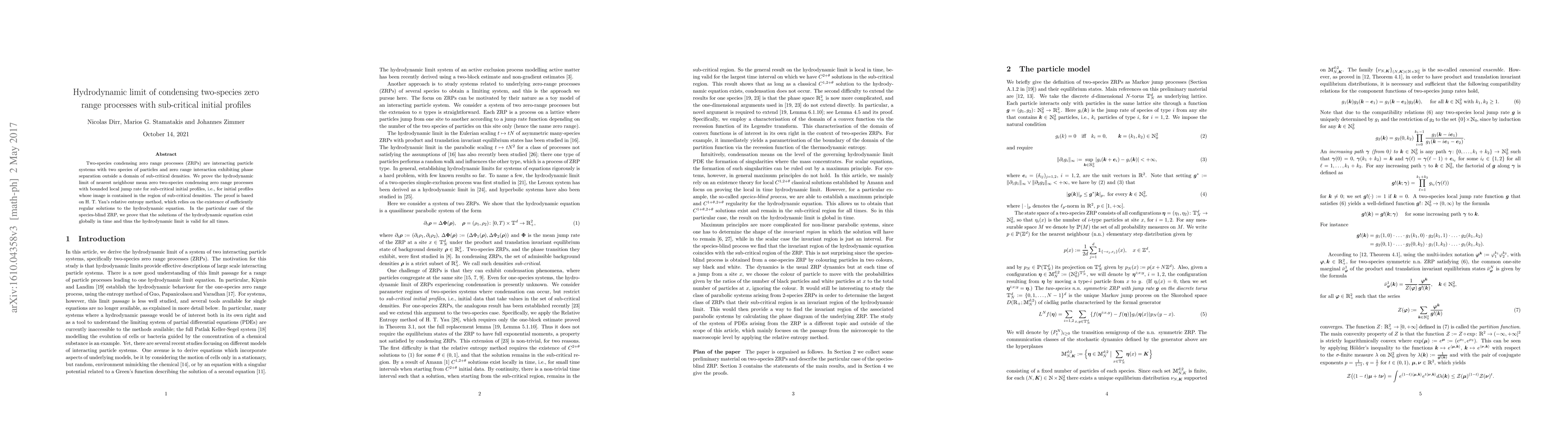 This paper proves the hydrodynamic limit for two-species condensing zero range processes with sub-critical initial densities, using Yau's relative entropy method. It demonstrates that solutions to the hydrodynamic equation exist globally in time for species-blind processes, ensuring the hydrodynamic limit's validity.