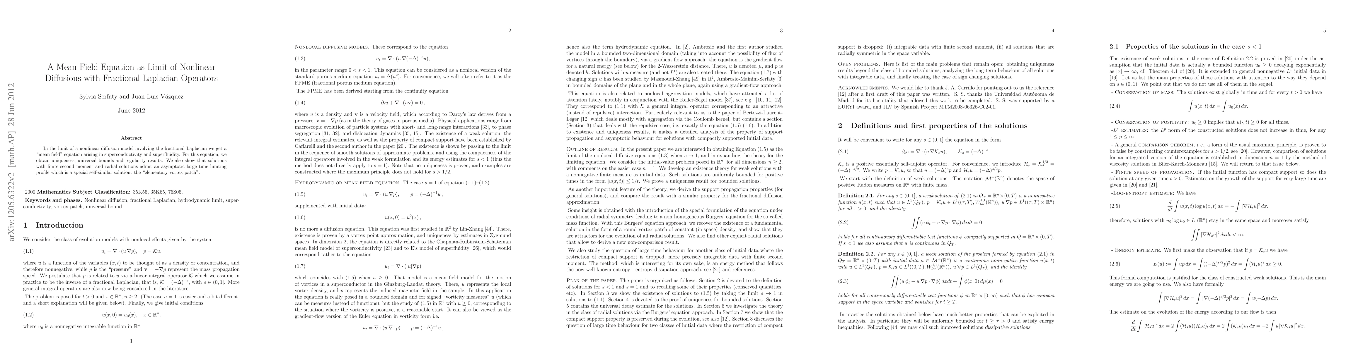 This paper investigates the hydrodynamic limit of nonlinear diffusion models with fractional Laplacian operators, deriving a "mean field" equation relevant to superconductivity and superfluidity. It establishes uniqueness, universal bounds, and regularity results, and demonstrates that certain solutions converge to an asymptotic self-similar "elementary vortex patch."
