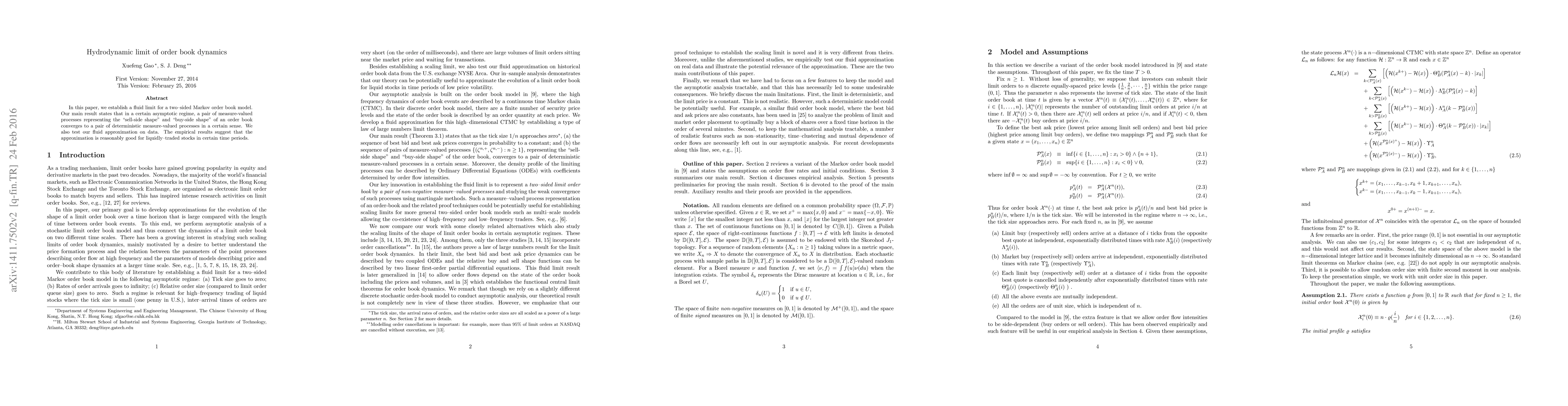 This paper establishes a fluid limit for a two-sided Markov order book model, showing that the order book's "sell-side shape" and "buy-side shape" converge to deterministic processes in an asymptotic regime. Empirical tests on liquid stocks indicate the fluid approximation performs well during specific time periods.