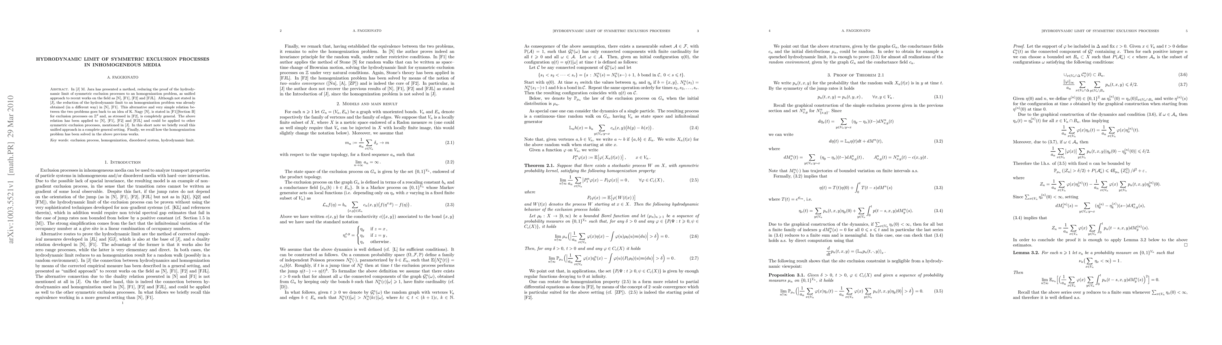 In \cite{J} M. Jara has presented a method, reducing the proof of the hydrodynamic limit of symmetric exclusion processes to an homogenization problem, as unified approach to recent works on the field as \cite{N}, \cite{F1}, \cite{F2} and \cite{FJL}. Although not stated in \cite{J}, the reduction of the hydrodynamic limit to an homogenization problem was already obtained (in a different way) in \cite{N}, \cite{F1}. This alternative and very simple relation between the two problems goes back to an idea of K.\ Nagy \cite{N}, is stated in \cite{F1}[Section B] for exclusion processes on $\bbZ^d$ and, as stressed in \cite{F2}, is completely general. The above relation has been applied to \cite{N}, \cite{F1}, \cite{F2} and \cite{FJL} and could be applied to other symmetric exclusion processes, mentioned in \cite{J}. In this short note we briefly recall this unified approach in a complete general setting. Finally, we recall how the homogenization problem has been solved in the above previous works.