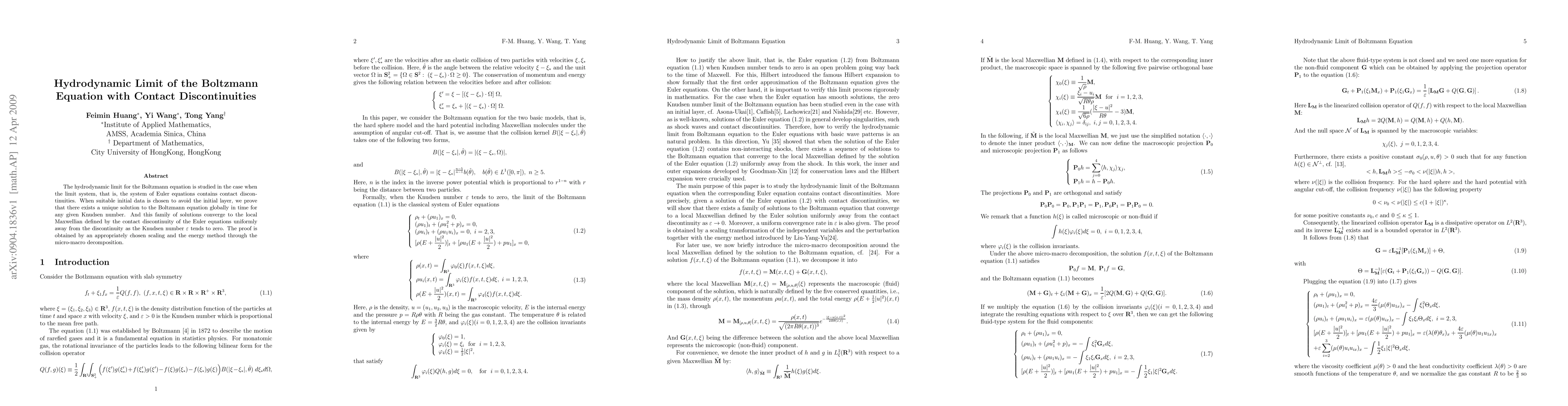 Researchers prove that a unique solution to the Boltzmann equation exists globally in time for systems with contact discontinuities, converging to local Maxwellian as Knudsen number approaches zero.