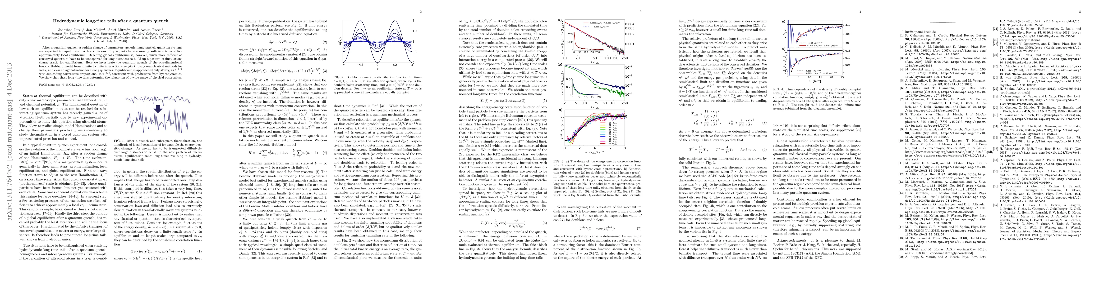 After a quantum quench, a sudden change of parameters, generic many particle quantum systems are expected to equilibrate. A few collisions of quasiparticles are usually sufficient to establish approximately local equilibrium. Reaching global equilibrium is, however, much more difficult as conserved quantities have to be transported for long distances to build up a pattern of fluctuations characteristic for equilibrium. Here we investigate the quantum quench of the one-dimensional bosonic Hubbard model from infinite to finite interaction strength U using semiclassical methods for weak, and exact diagonalization for strong quenches. Equilibrium is approached only slowly, as t^{-1/2} with subleading corrections proportional to t^{-3/4}, consistent with predictions from hydrodynamics. We show that these long-time tails determine the relaxation of a wide range of physical observables.
