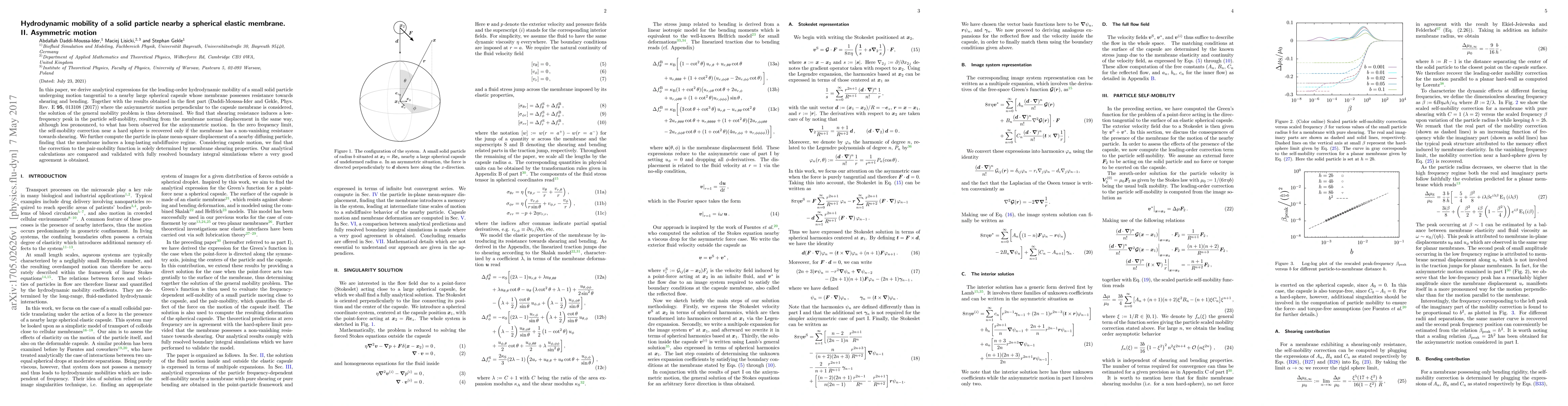 In this paper, we derive analytical expressions for the leading-order hydrodynamic mobility of a small solid particle undergoing motion tangential to a nearby large spherical capsule whose membrane possesses resistance towards shearing and bending. Together with the results obtained in the first part (Daddi-Moussa-Ider and Gekle, Phys. Rev. E {\bfseries 95}, 013108 (2017)) where the axisymmetric motion perpendicular to the capsule membrane is considered, the solution of the general mobility problem is thus determined. We find that shearing resistance induces a low-frequency peak in the particle self-mobility, resulting from the membrane normal displacement in the same way, although less pronounced, to what has been observed for the axisymmetric motion. In the zero frequency limit, the self-mobility correction near a hard sphere is recovered only if the membrane has a non-vanishing resistance towards shearing. We further compute the particle in-plane mean-square displacement of a nearby diffusing particle, finding that the membrane induces a long-lasting subdiffusive regime. Considering capsule motion, we find that the correction to the pair-mobility function is solely determined by membrane shearing properties. Our analytical calculations are compared and validated with fully resolved boundary integral simulations where a very good agreement is obtained.