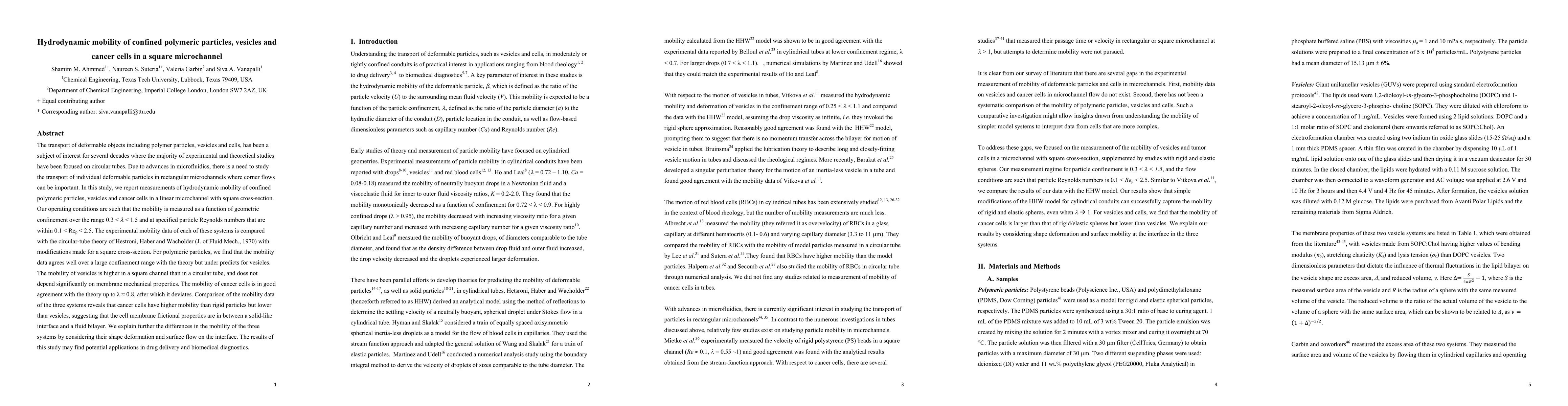 This study measures the hydrodynamic mobility of polymeric particles, vesicles, and cancer cells in a square microchannel, finding that cancer cells have higher mobility than rigid particles but lower than vesicles, with implications for drug delivery and biomedical diagnostics.