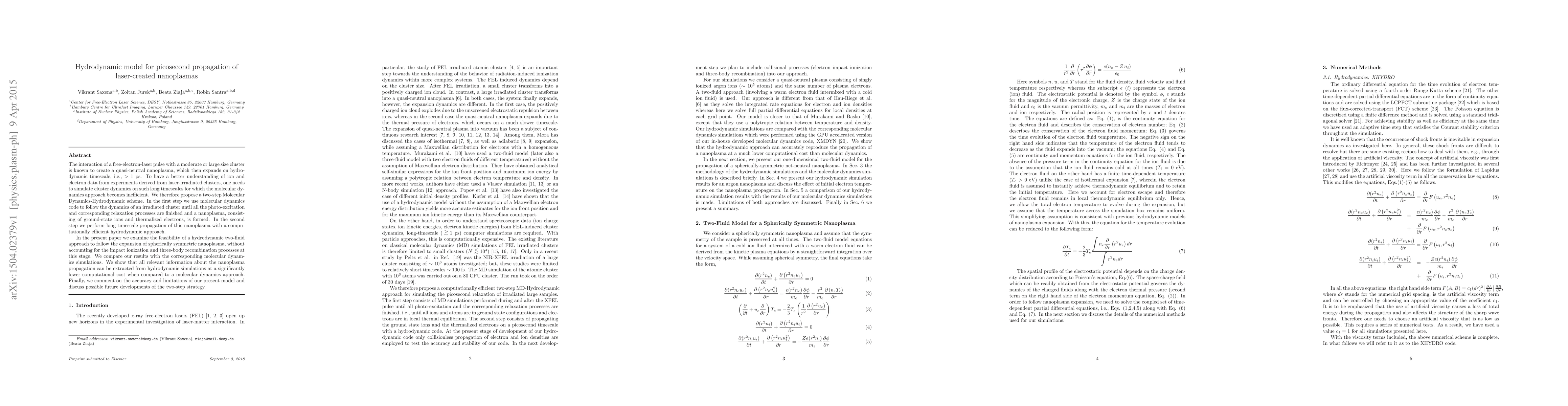 This paper proposes a two-step Molecular Dynamics-Hydrodynamic scheme to simulate the picosecond expansion of laser-created nanoplasmas from clusters, demonstrating that hydrodynamic simulations can provide accurate results at a lower computational cost compared to molecular dynamics, while discussing the model's limitations and future improvements.