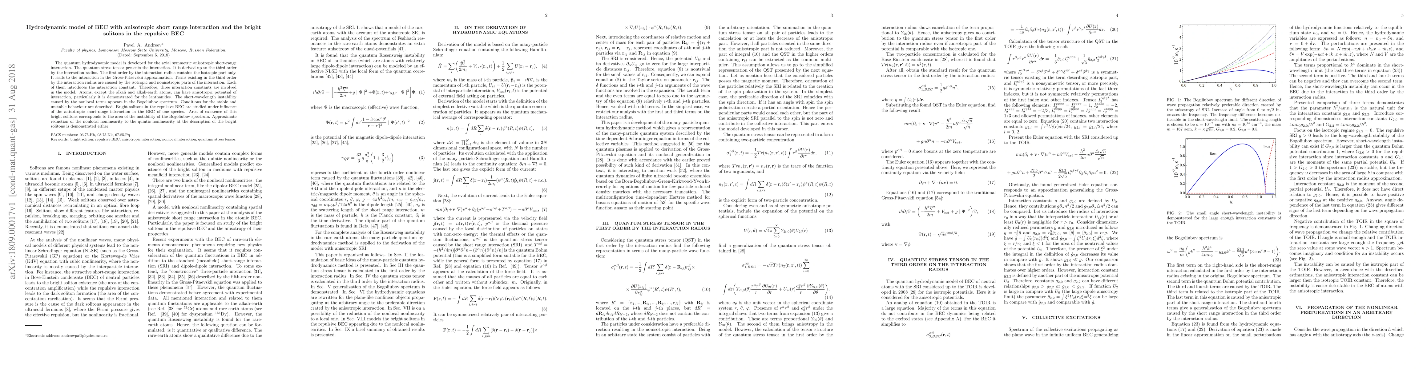 This paper develops a quantum hydrodynamic model for axially symmetric anisotropic short-range interactions in Bose-Einstein condensates (BEC), identifying three interaction constants. It explores the conditions for stable and unstable behavior, and studies bright solitons in repulsive BEC, showing their existence correlates with the Bogoliubov spectrum's instability.